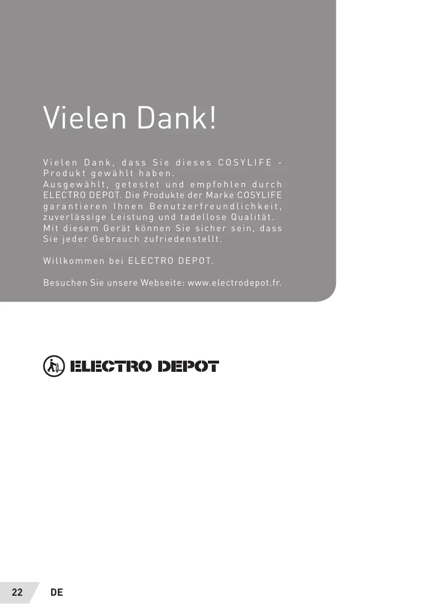 Vielen Dank! Vielen Dank, dass Sie dieses COSYLIFE - Produkt gewählt haben. Ausgewählt, getestet und empfohlen durch ELECTRO DEPOT. Die Produkte der Marke COSYLIFE garantieren lhnen Benutzerfreundlichkeit, zuverlässige Leistung und tadellose Qualität Mit diesem Gerät kônnen Sie sicher sein, dass Sie jeder Gebrauch zufriedenstellt. Willkommen bei ELECTRO DEPOT. Besuchen Sie unsere Webseite: www.electrodepot.