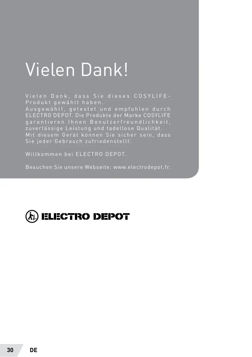 Vielen Dank! Vielen Dank, dass Sie dieses COSYLIFE- Produkt gewählt haben. Ausgewählt, getestet und empfohlen durch ELECTRO DEPOT. Die Produkte der Marke COSYLIFE garantieren lhnen Benutzerfreundlichkeit, zuverlässige Leistung und tadellose Qualität Mit diesem Gerät kônnen Sie sicher sein, dass Sie jeder Gebrauch zufriedenstellt. Willkommen bei ELECTRO DEPOT. Besuchen Sie unsere Webseite: www.electrodepot.fr.