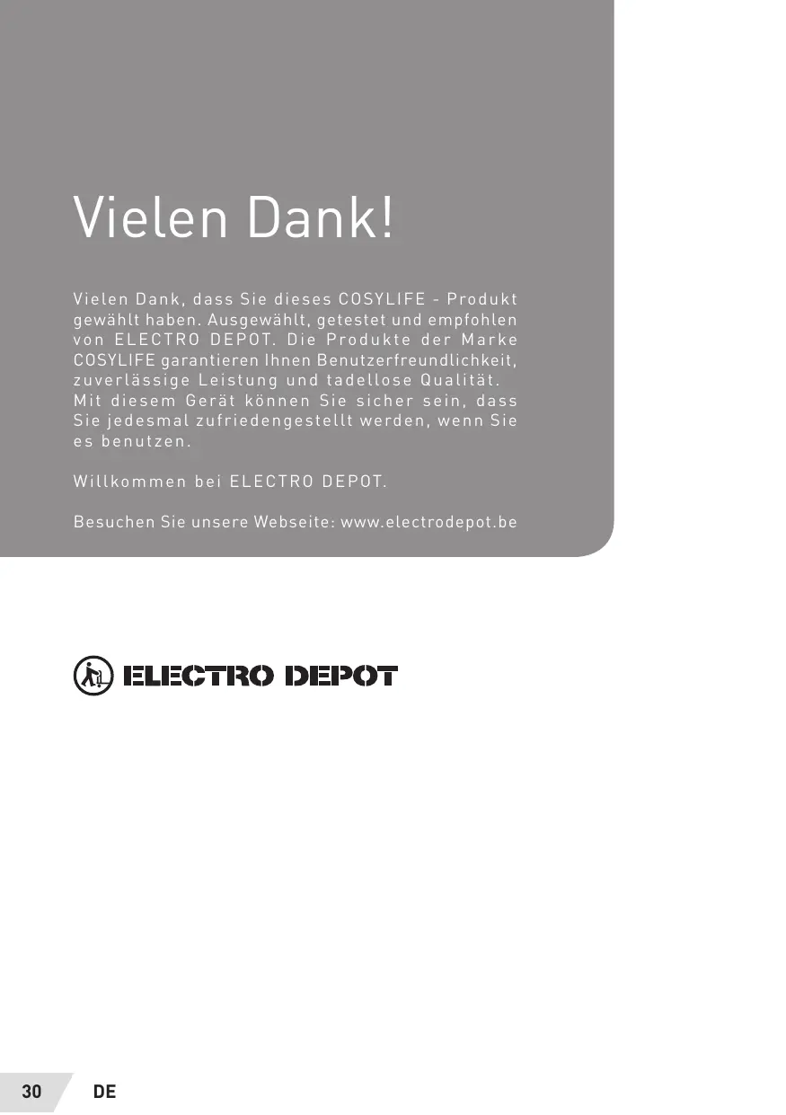 Vielen Dank! Vielen Dank, dass Sie dieses COSYLIFE - Produkt gewählt haben. Ausgewählt, getestet und empfohlen von ELECTRO DEPOT. Die Produkte der Marke COSYLIFE garantieren Ihnen Benutzerfreundlichkeit, zuverlässige Leistung und tadellose Qualität. Mit diesem Gerät kônnen Sie sicher sein, dass Sie jedesmal zufriedengestellt werden, wenn Sie es benutzen. Willkommen bei ELECTRO DEPOT. Besuchen Sie unsere Webseite: www.electrodepot.be