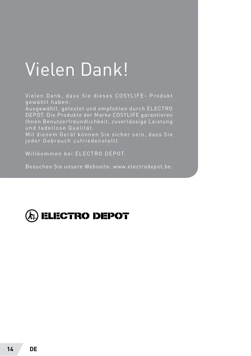 Vielen Dank! Vielen Dank, dass Sie dieses COSYLIFE- Produkt gewählt haben. Ausgewählt, getestet und empfohlen durch ELECTRO DEPOT. Die Produkte der Marke COSYLIFE garantieren Ihnen Benutzerfreundlichkeit, zuverlässige Leistung und tadellose Qualität. Mit diesem Gerät kônnen Sie sicher sein, dass Sie jeder Gebrauch zufriedenstellt. Willkommen bei ELECTRO DEPOT. Besuchen Sie unsere Webseite: www.el: