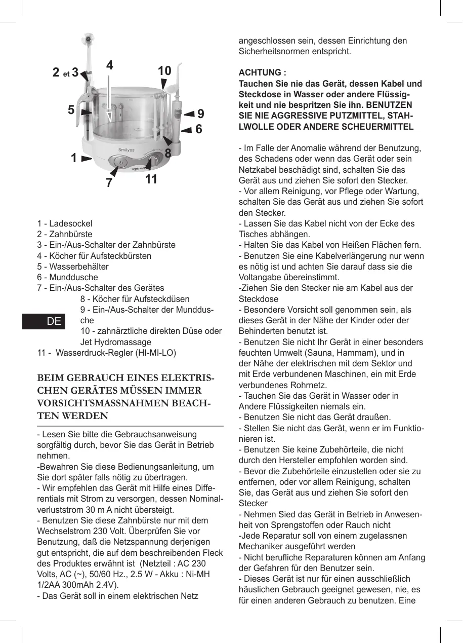 VORSICHTSMASSNAHMEN BEACH- TEN WERDEN - Lesen Sie bitte die Gebrauchsanweisung sorgfältig durch, bevor Sie das Gerät in Betrieb nehmen. -Bewahren Sie diese Bedienungsanleitung, um Sie dort spâter falls nôtig zu übertragen. - Wir empfehlen das Gerät mit Hife eines Diffe- rentials mit Strom zu versorgen, dessen Nominal- verluststrom 30 m A nicht übersteigt. - Benutzen Sie diese Zahnbürste nur mit dem Wechselstrom 230 Voit. Überprüfen Sie vor Benutzung, da& die Netzspannung derjenigen gut entspricht, die auf dem beschreibenden Fleck des Produktes erwähnt ist (Netzteil : AC 230 Volts, AC (-), 50/60 Hz., 2.5 W - Akku : Ni-MH 1/2AA 300mAh 2.4V). - Das Gerät soll in einem elektrischen Netz angeschlossen sein, dessen Einrichtung den Sicherheitsnormen entspricht. ACHTUNG : Tauchen Sie nie das Gerät, dessen Kabel und Steckdose in Wasser oder andere Flüssig- keit und nie bespritzen Sie ihn. BENUTZEN