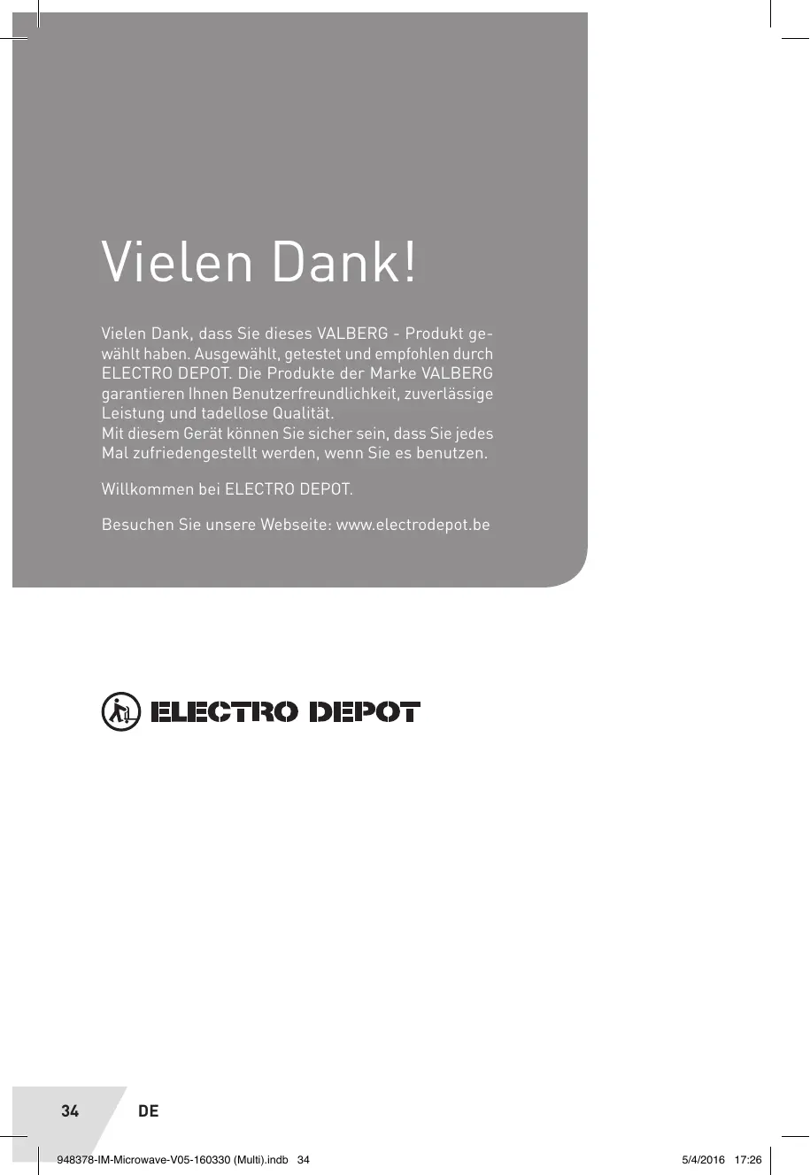 Vielen Dank! Vielen Dank, dass Sie dieses VALBERG - Produkt ge- wählt haben. Ausgewähit, getestet und empfohlen durch ELECTRO DEPOT. Die Produkte der Marke VALBERG garantieren Ihnen Benutzerfreundlichkeit, zuverlässige Leistung und tadellose Qualität Mit diesem Gerät kônnen Sie sicher sein, dass Sie jedes Mal zufriedengestellt werden, wenn Sie es benutzen. Willkommen bei ELECTRO DEPOT. Besuchen Sie unsere Webseite: www.electrodepot.be >TRO DEPOT 34 DE 248378-IM-Microwave-VO5-160880 (Mult).indb 34 S/42016 17:26