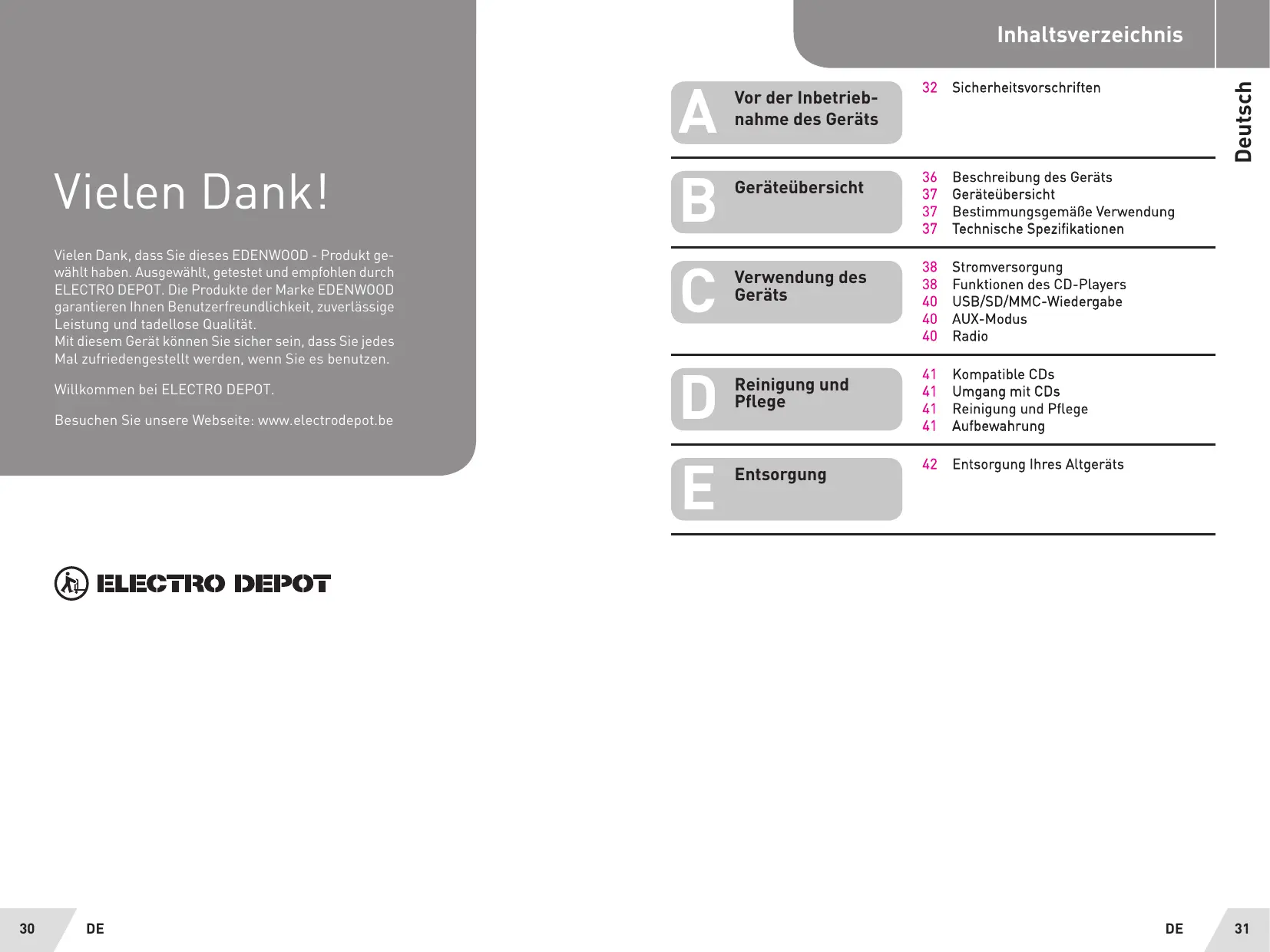 Vielen Dank! Vielen Dank, dass Sie dieses EDENWOOD - Produkt ge- wählt haben. Ausgewählt, getestet und empfohlen durch ELECTRO DEPOT. Die Produkte der Marke EDENWOOD garantieren Ihnen Benutzerfreundlichkeit, zuverlässige Leistung und tadellose Qualität. Mit diesem Gerät künnen Sie sicher sein, dass Sie jedes Mal zufriedengestellt werden, wenn Sie es benutzen. Willkommen bei ELECTRO DEPOT. Besuchen Sie unsere Webseite: www.electrodepot.be TRO DEPOT 30 DE Inhaltsverzeichnis orricrie- 32 Sicherheitsvorschriften 5 nahme des Geräts 5 [A] mr a 36 Beschreibung des Geräts Geräteübersicht 37 Geräteübersicht 37 Bestimmungsgemäfie Verwendung 37 Technische Spezifikationen 38 Stromversorgung Verwendung des 38 Funktionen des CD-Players Geräts 40 USB/SD/MMC-Wiedergabe 40 AUX-Modus 40 Radio Reini d 41 Kompatible CDs EHESS) un 41 Umgang mit CDs EU 41 Reinigung und Pflege 41 Aufbewahrung 42 Entsorgunglhres Altgeräts Entsorgung DE 31