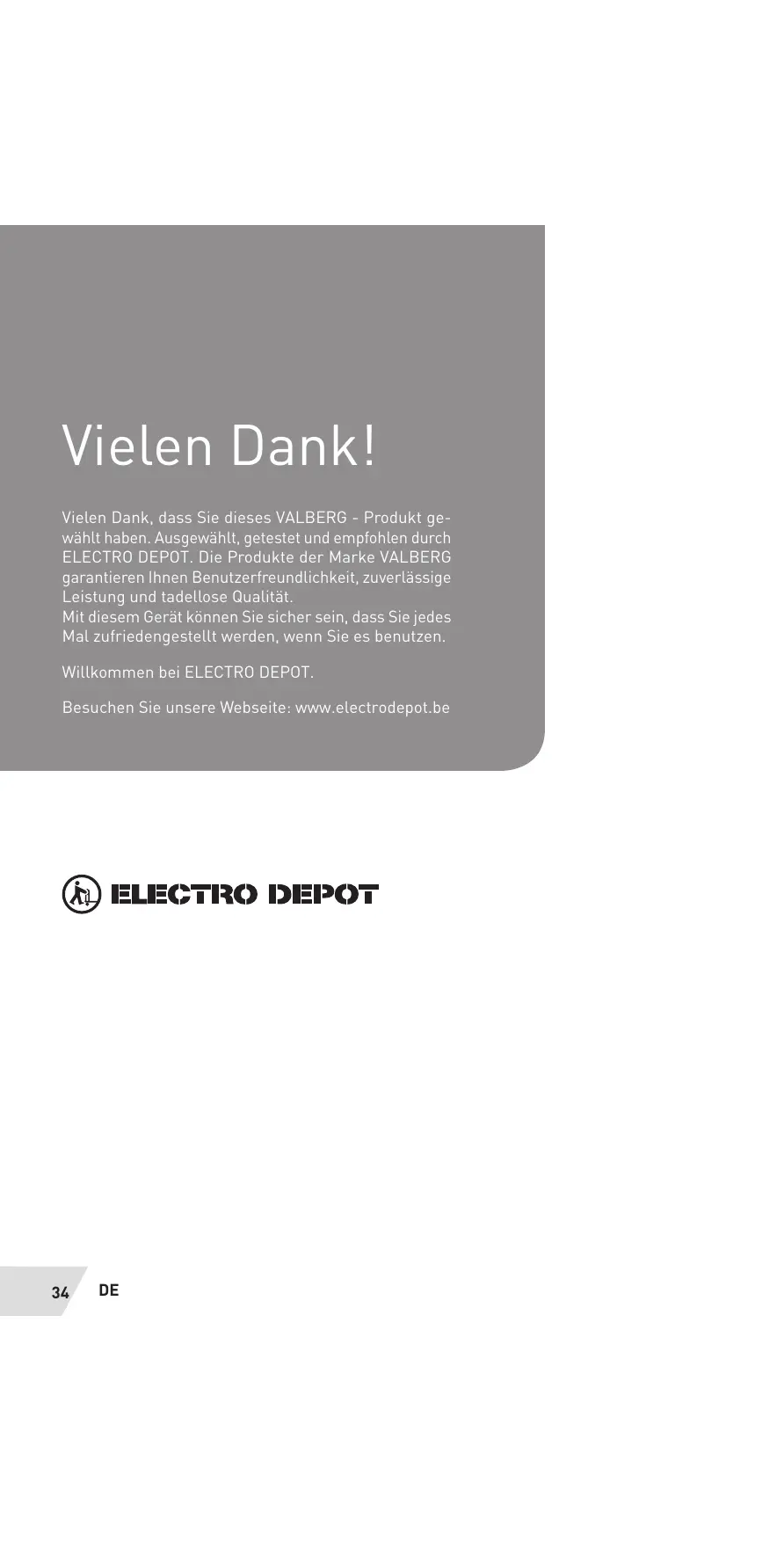 Vielen Dank! Vielen Dank, dass Sie dieses VALBERG - Produkt ge- wählt haben. Ausgewählt, getestet und empfohlen durch ELECTRO DEPOT. Die Produkte der Marke VALBERG garantieren Ihnen Benutzerfreundlichkeit, zuverlässige Leistung und tadellose Qualität Mit diesem Gerät kônnen Sie sicher sein, dass Sie jedes ellt werden, wenn Sie es benutzen. Willkommen bei ELECTRO DEPOT. Besuchen Sie unsere Webseite: www.electrodepot.be 34 DE
