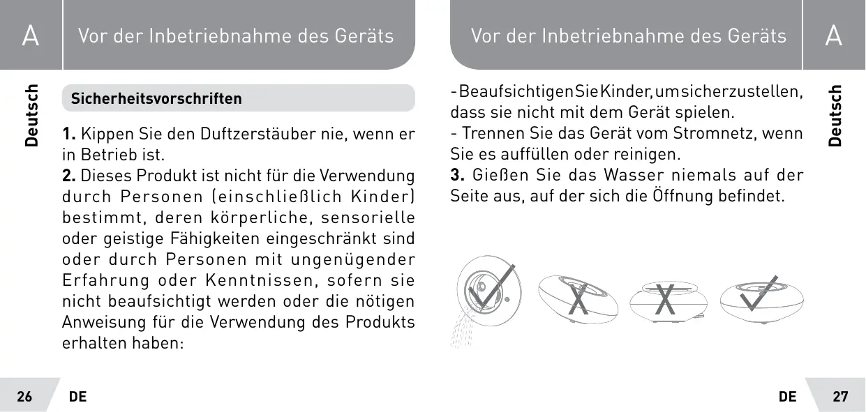 - Kippen Sie den Duftzerstäuber nie, wenn er in Betrieb ist.