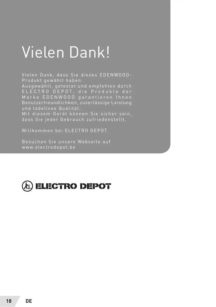 Vielen Dank! Vielen Dank, dass Sie dieses EDENWOOD- Produkt gewählt haben. Ausgewählt, getestet und empfohlen durch ELECTRO DEPOT, die Produkte der Marke EDENWOOD garantieren lhnen Benutzerfreundlichkeit, zuverlässige Leistung und tadellose Qualität. Mit diesem Gerät kônnen Sie sicher sein, dass Sie jeder Gebrauch zufriedenstellt Willkommen bei ELECTRO DEPOT. Besuchen Sie unsere Webseite auf www.electrodepot.be