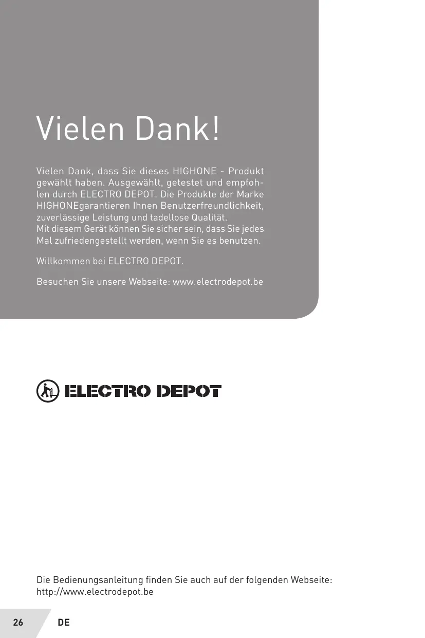 Vielen Dank, dass Sie diesen HIGHONE - Produkt gewählt haben. Ausgewählt, getestet und empfohlen durch ELECTRO DEPOT. Die Produkte der Marke HIGHONEgarantieren Ihnen Benutzerfreiundlichkeit, zuverlassicte Leistung und tadellose Qualität. Mit diesen Gerät konnen Sie sichere sein, dass Sie jeder Mal zufriedengestellt werden, wenn Sie es benutzen.