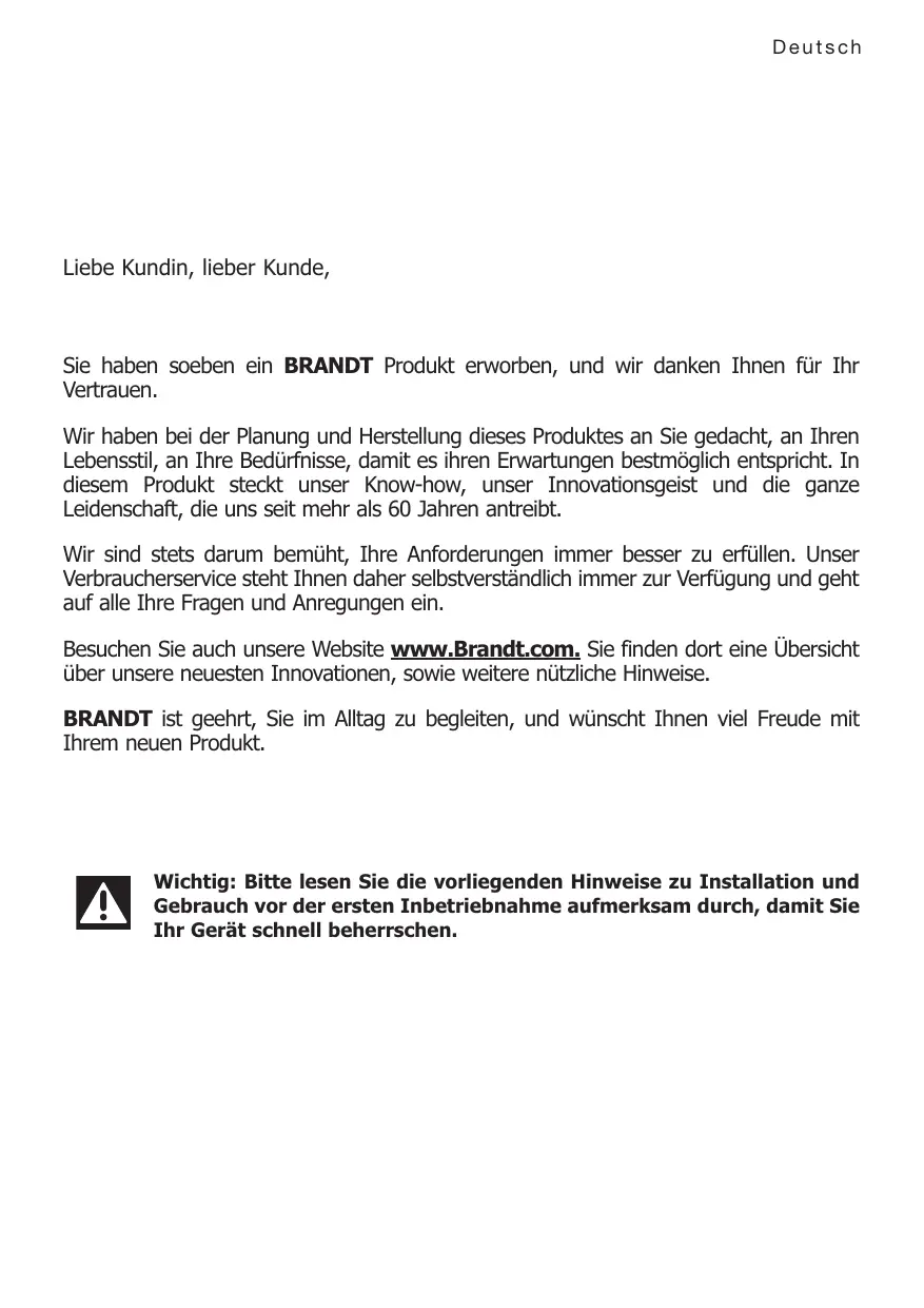 Sie haben sogeben ein BRANDT Produkt erworben, und wir danken Ohnen für Ihr Vertrauen.