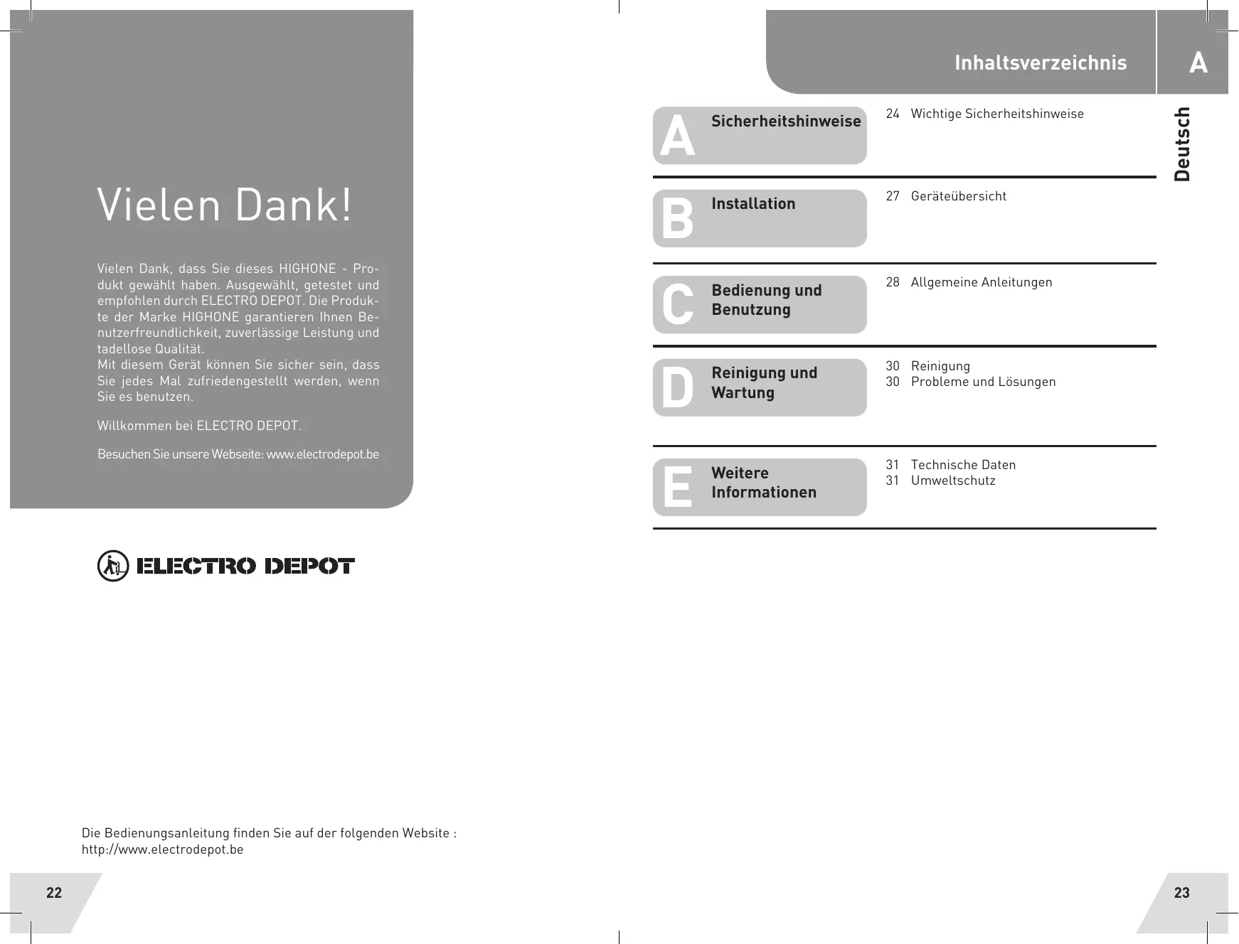 Inhaltsverzeichnis Sicherheitshinweise 24 Wichtige Sicherheitshinweise Deutsch VI e Le n Da n K | Installation 27 Geräteübersicht Vielen Dank, dass Sie dieses HIGHONE - Pro- dukt gewählt haben. Ausgewählt, getestet und Bedienung un empfohlen durch ELECTRO DEPOT. Die Produk- pe " CE tn) te der Marke HIGHONE garantieren Ihnen Be- enutzung nutzerfreundlichkeit, zuverlässige Leistung und tadellose Qualität Mit diesem Gerät kônnen Sie sicher sein, dass " 30 Sie jedes Mal zufriedengestellt werden, wenn Reinigung und 30 Sie es benutzen. Wartung 28 Allgemeine Anleitungen Reinigung Probleme und Lôsungen Willkommen bei ELECTRO DEPOT. Besuchen Sie unsere Webseite: www.electrodepot.be ; Weitel 31 Technische Daten GUXE | 31 Umweltschutz Informationen >TRO DEPOT Die Bedienungsanleitung finden Sie auf der folgenden Website : http:/{www.electrodepot.be