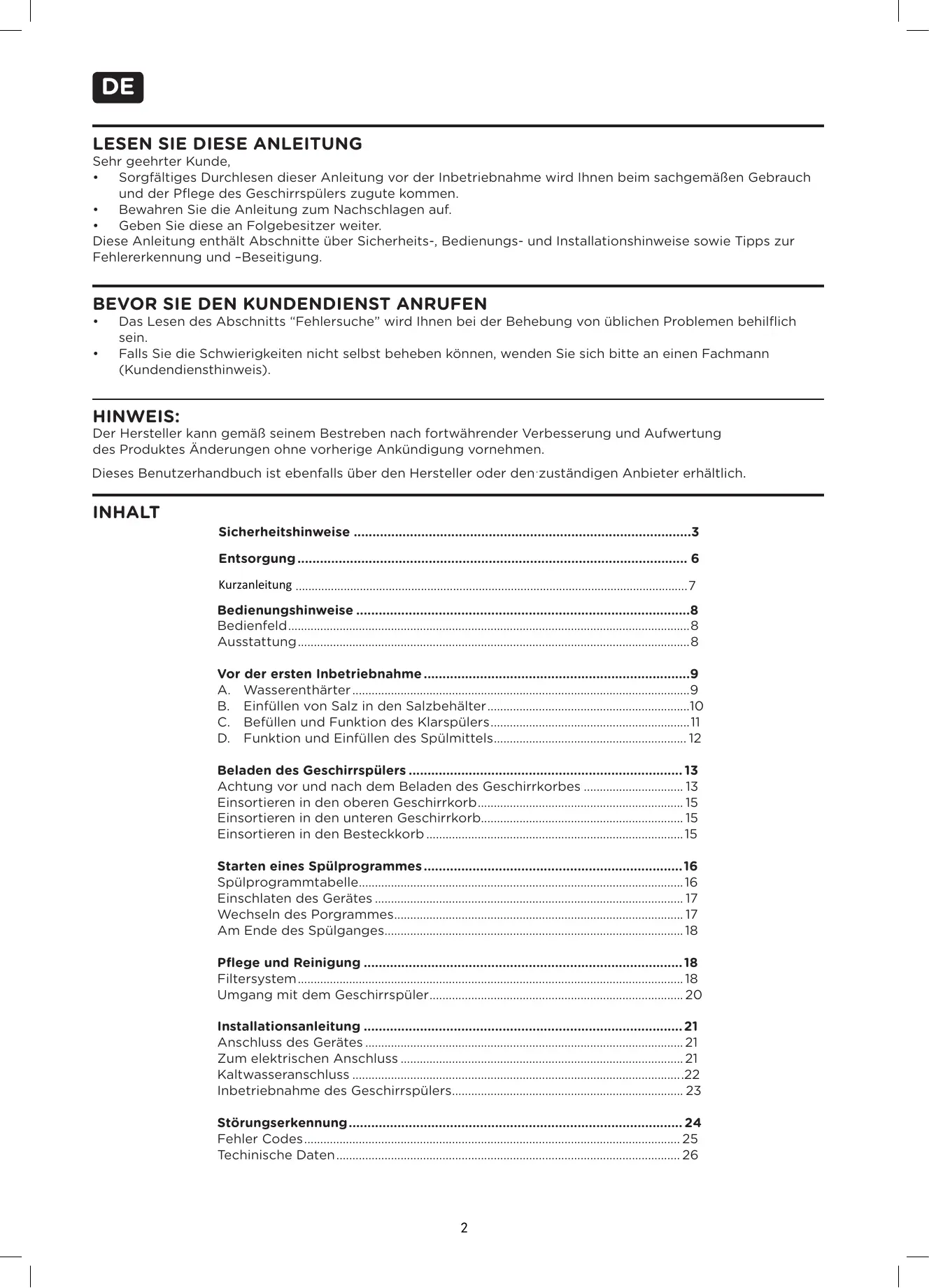 Das Lesen des Abschnitts “Fehlersuche” wird Ihnen bei der Behebung von üblichen Problemen behilflich sein. + __ Falls Sie die Schwierigkeiten nicht selbst beheben kônnen, wenden Sie sich bitte an einen Fachmann (Kundendiensthinweis). HINWEIS: Der Hersteller kann gemäB seinem Bestreben nach fortwährender Verbesserung und Aufwertung des Produktes Ânderungen ohne vorherige Ankündigung vornehmen. Dieses Benutzerhandbuch ist ebenfalls über den Hersteller oder den‘zuständigen Anbieter erhältlich. INHALT Sicherheitshinweise … Entsorgung.… Kurzanleitung … Bedienungshinweise Bedienfeld.… Ausstattung Vor der ersten Inbetriebnahme. A. _ Wasserenthärte: B. Einfüllen von Salz in den Salzbehälter C. Befüllen und Funktion des Klarspülers D. Funktion und Einfüllen des Spülmittels. Beladen des Geschirrspülers Achtung vor und nach dem Beladen des Geschirrkorbes Einsortieren in den oberen Geschirrkorb.….. Einsortieren in den unteren Geschirrkorb.. Einsortieren in den Besteckkorb …. Starten eines Spülprogrammes ….. Spülprogrammtabelle... Einschlaten des Gerätes. Wechseln des Porgrammes. Am Ende des Spülganges..…..….….. Pflege und Reinigung. Filtersystem… Umgang mit dem Geschirrspi ler. Installationsanleitung Anschluss des Gerätes . Zum elektrischen Anschluss . Kaltwasseranschluss …. Inbetriebnahme des Geschirrspülers. Stôrungserkennung Fehler Codes... Techinische Daten……