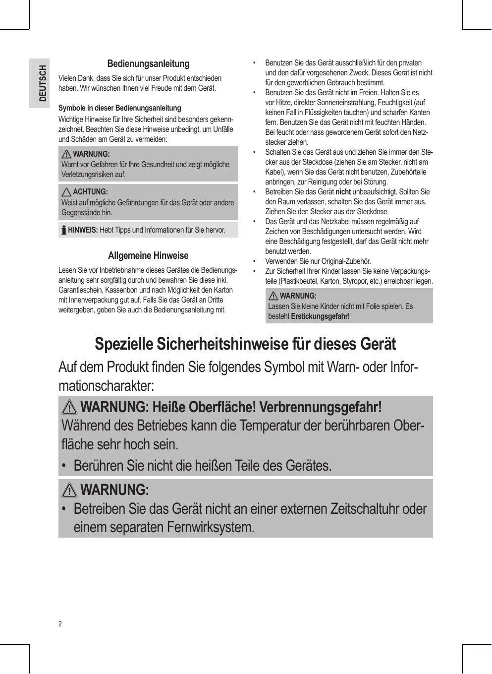 Ne l'utisez pas en extérieurs. Gardez-e à l'abri de la chaleur, des rayons directs du soleil, de l'humidité (ne l'mmergez en aucun cas dans des liquides) et des angles des meubles. N'utlisez pas cet apparel avec des mains moullées. Sil'apparel est mouillé, débranchezle immédia- tement.