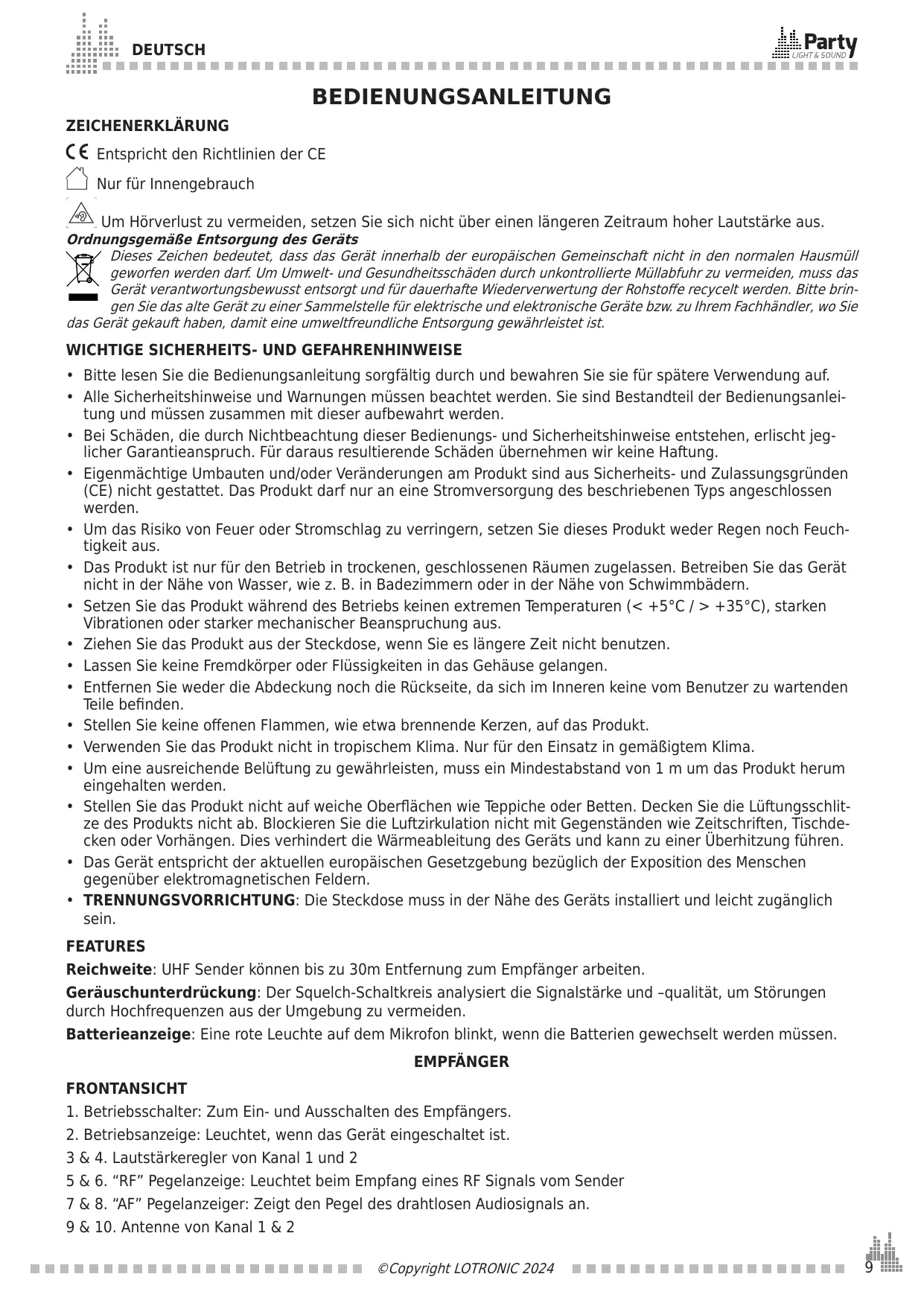Finden Sie kostenlos die Bedienungsanleitung des Geräts PARTY-200UHF PARTY LIGHT&SOUND als PDF.