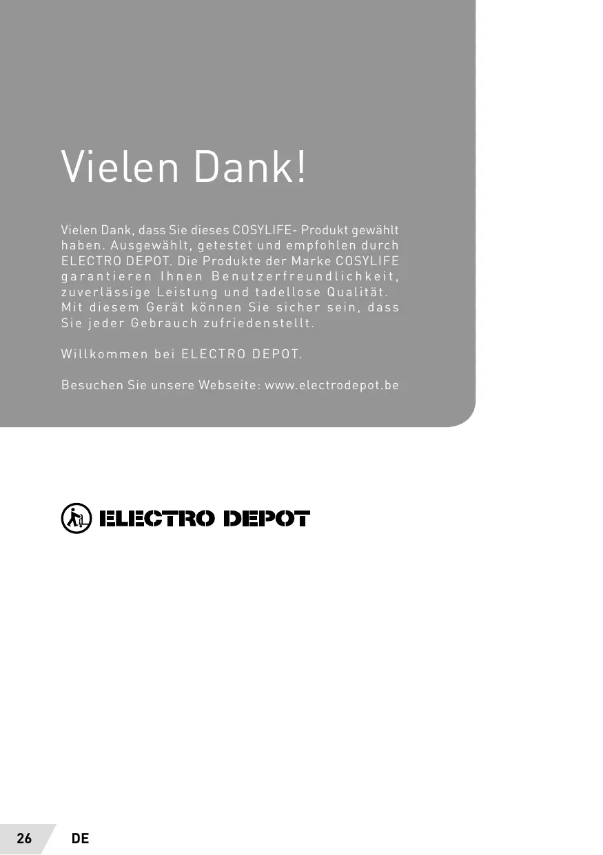 Vielen Dank! Vielen Dank, dass Sie dieses COSYLIFE- Produkt gewählt haben. Ausgewählt, getestet und empfohlen durch ELECTRO DEPOT. Die Produkte der Marke COSYLIFE garantieren lhnen Benutzerfreundlichkeit, zuverlässige Leistung und tadellose Qualität Mit diesem Gerät kônnen Sie sicher sein, dass Sie jeder Gebrauch zufriedenstellt. Willkommen bei ELECTRO DEPOT. Besuchen Sie unsere Webseite: www.electrodepot.be