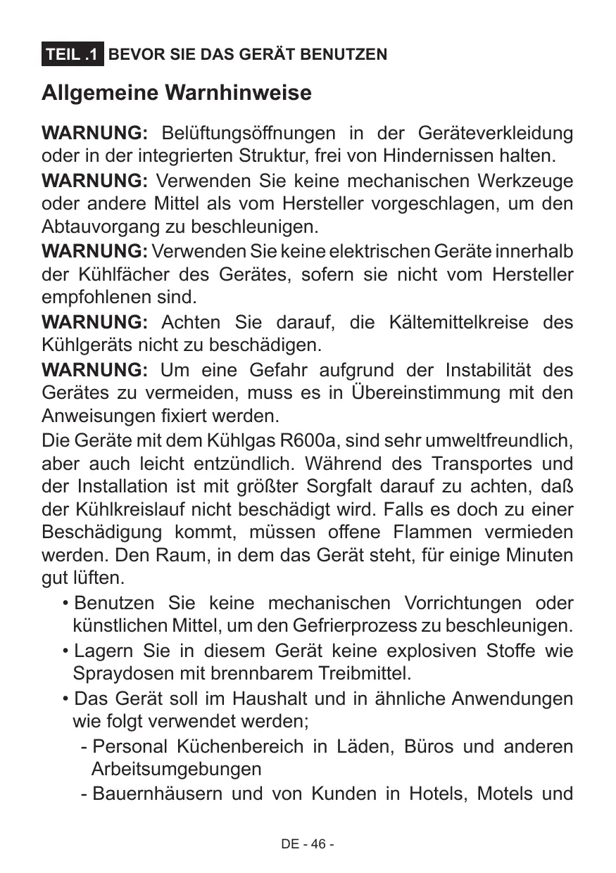 Allgemeine Warnhinweise WARNUNG: Belüftungsôffnungen in der Geräteverkleidung oder in der integrierten Struktur, frei von Hindernissen halten. WARNUNG: Verwenden Sie keine mechanischen Werkzeuge oder andere Mittel als vom Hersteller vorgeschlagen, um den Abtauvorgang zu beschleunigen. WARNUNG: Verwenden Sie keine elektrischen Gerâte innerhalb der Kühlfächer des Gerâtes, sofern sie nicht vom Hersteller empfohlenen sind. WARNUNG: Achten Sie darauf, die Kältemittelkreise des Kühigeräts nicht zu beschädigen. WARNUNG: Um eine Gefahr aufgrund der Instabilität des Gerätes zu vermeiden, muss es in Übereinstimmung mit den Anweisungen fixiert werden. Die Gerâte mit dem Kühlgas R600a, sind sehr umweltfreundlich, aber auch leicht entzündlich. Während des Transportes und der Installation ist mit grôRter Sorgfalt darauf zu achten, daR der Kühlkreislauf nicht beschädigt wird. Falls es doch zu einer Beschädigung kommt, müssen offene Flammen vermieden werden. Den Raum, in dem das Gerät steht, für einige Minuten gut lüften. *Benutzen Sie keine mechanischen Vorrichtungen oder künstlichen Mittel, um den Gefrierprozess zu beschleunigen. + Lagern Sie in diesem Gerät keine explosiven Stoffe wie Spraydosen mit brennbarem Treibmittel. + Das Gerät soll im Haushalt und in ähnliche Anwendungen wie folgt verwendet werden; - Personal Küchenbereich in Läden, Büros und anderen Arbeitsumgebungen - Bauernhäusern und von Kunden in Hotels, Motels und DE -46-