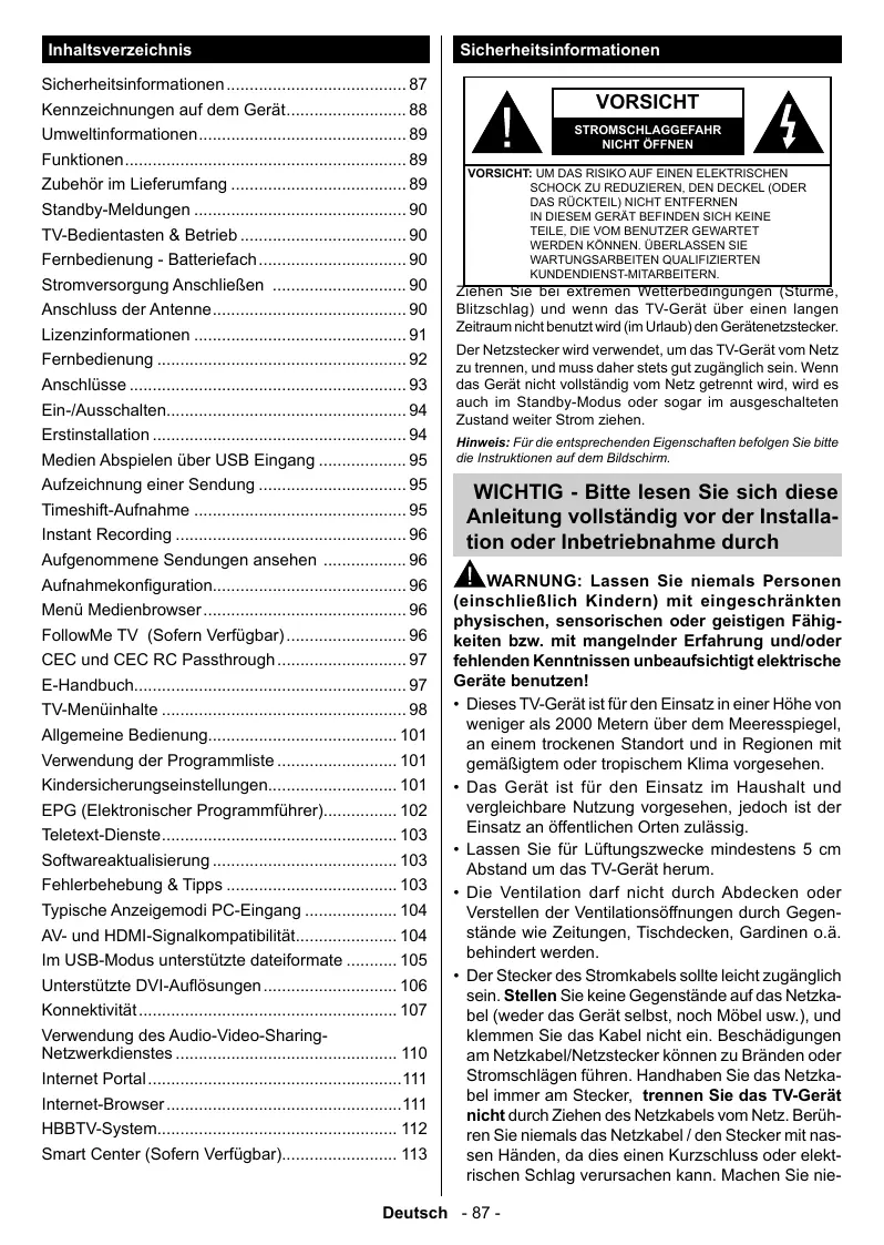 û VORSICHT STROMSCHLAGGEFAHR NICHT OFFNEN IMORSICHE UN DAS RISIKO AUF EINEN ELERTRISONEN SCHOCK ZU REDUZIEREN, DEN DECKEL (ODER DAS RÜCKTEIL) NICHT ENTFERNEN IN DIESEN GERAT BEFINDEN SICH KEINE TEILE, DIE VOM BENUTZER GEWARTET WERDEN KONNEN. ÜBERLASSEN SIE WARTUNGSARBEITEN QUALIFLZIERTEN KUNDENDIENST-MITARBEITERN. RREN STE Der exTremen Weltemedmgungen (Sum, Blitzschlag) und wenn das TV-Gerät über einen langen Zeïtraum nichtbenutztwird (im Uriaub) den Gerétenetzstecker. Der Netzstecker wird venvendet, um das TV-Gerät vom Netz zu trennen, und muss daher stets gut zugänglich sein. Wenn das Gerät nicht vollständig vom Netz getrennt wird, wird es. auch im Standby-Modus oder sogar im ausgeschalteten Zustand weiter Strom ziehen.