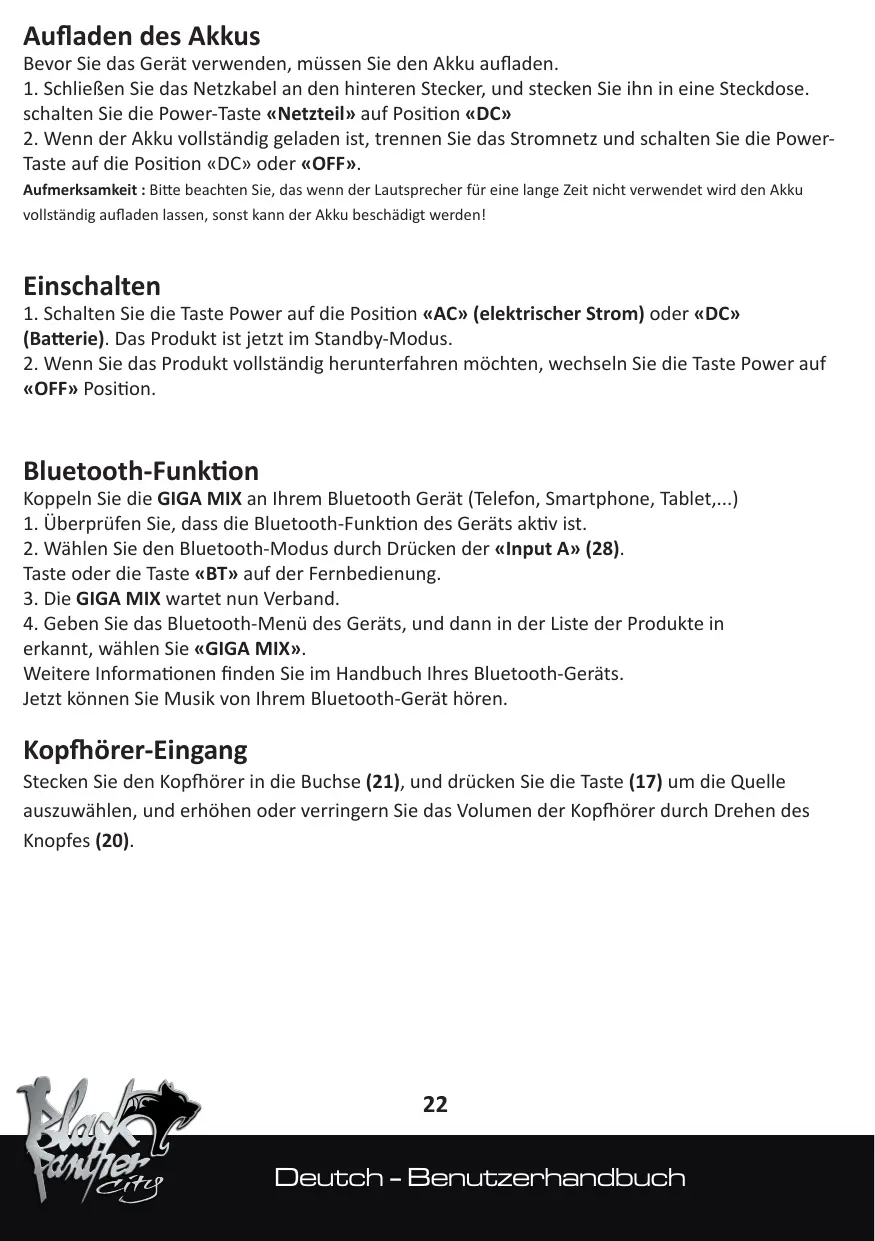 GIGA MIX - Aktivlautsprecher BLACK PANTHER - Kostenlose Bedienungsanleitung