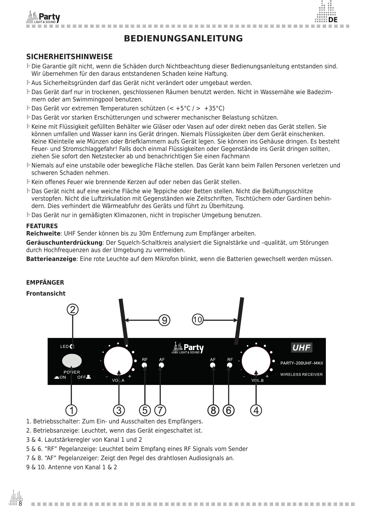 BEDIENUNGSANLEITUNG PARTY-200UHF V2 PARTY LIGHT&SOUND