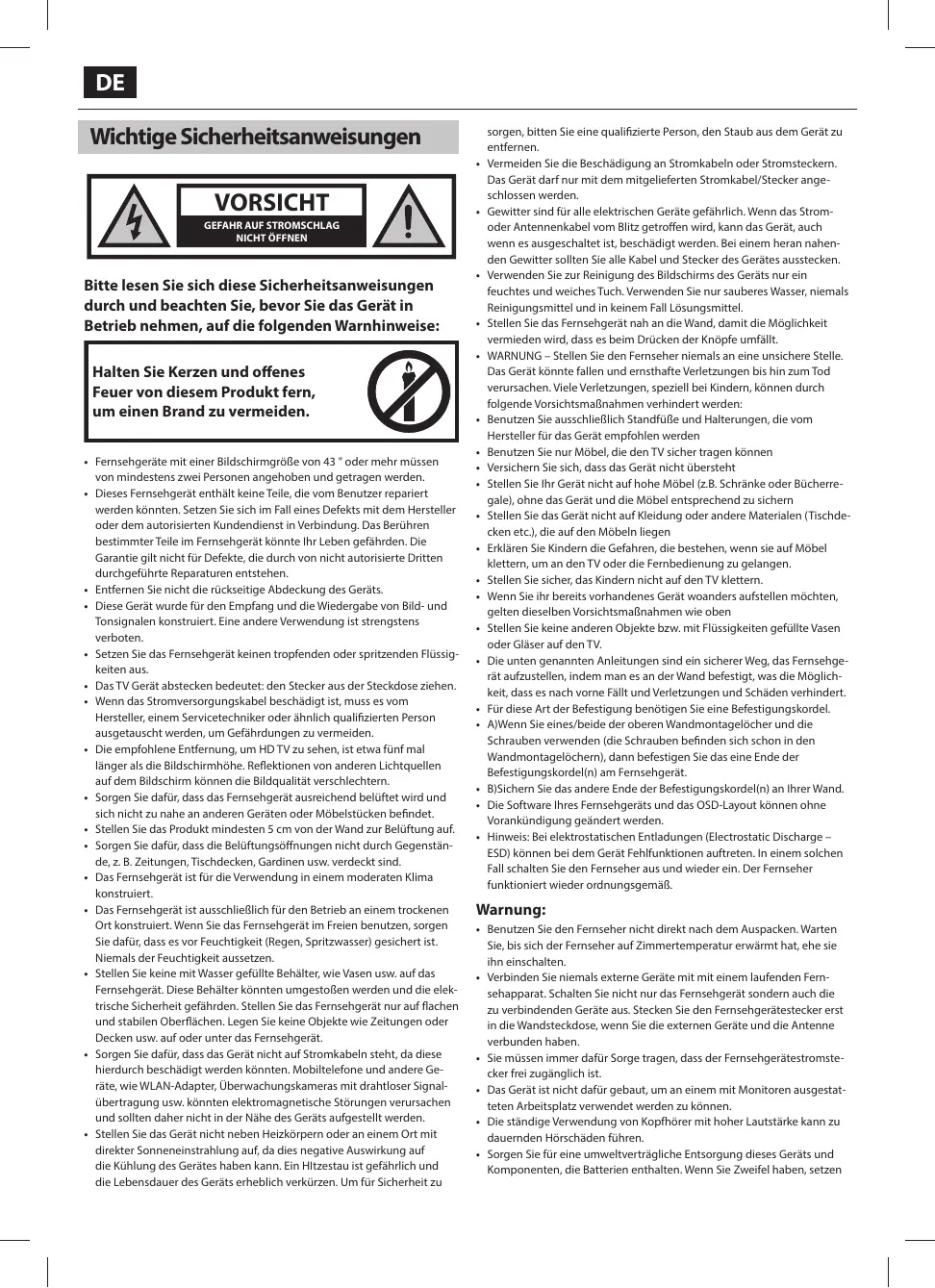 Ne placez pas d'objets, de récipients remplis de liquide, comme des vases, ete. sur la télévision. Ces récipients pourraient tre renversés, ce qui mettrait en danger la sécurité électrique. Placer la TV exclusivement sur des surfaces plates et stables, Ne placer aucun objet tel qu'un journal ou une couverture, etc. sur ou sous la TV.