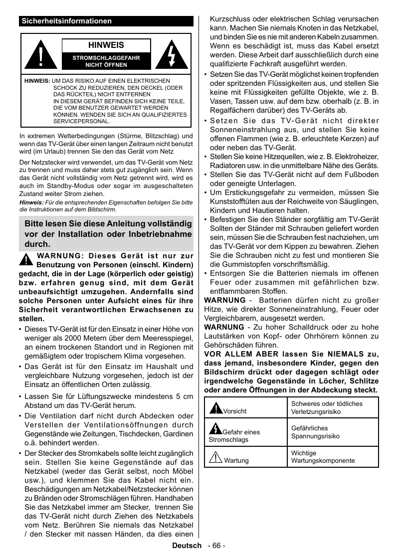 + Klären Sie Ihre Kinder darüber auf, dass es gefährlich ist, auf hohe Môbelstücke zu kletten, um das TV- Gerät oder die Fernbedienung zu erreichen. Wenn Sie Ihr vorhandenes TV-Gerät weiterhin nutzen und an einen neuen Platz stellen, sind die gleichen Vorsichtsma@nahmen zu beachten.