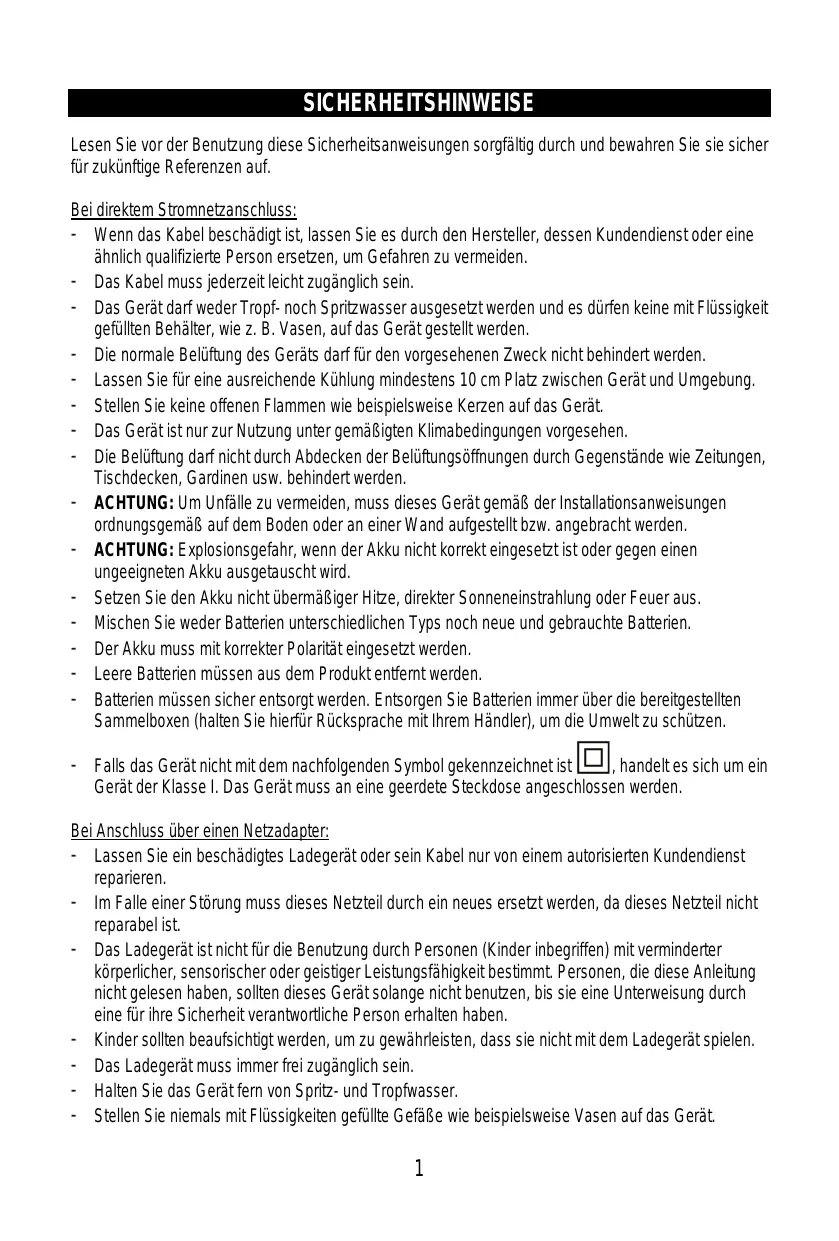 - Das Ladegerät ist nicht für die Benutzung durch Personen (Kinder inbegriffen) mit verminderter kôrpericher, sensorischer oder geistiger Leistungsfähigkeit bestimmt. Personen, die diese Anleitung nicht gelesen haben, sollten dieses Gerät solange nicht benutzen, bis sie eine Unterweisung durch eine für ihre Sicherheit verantwortiiche Person erhalten haben.