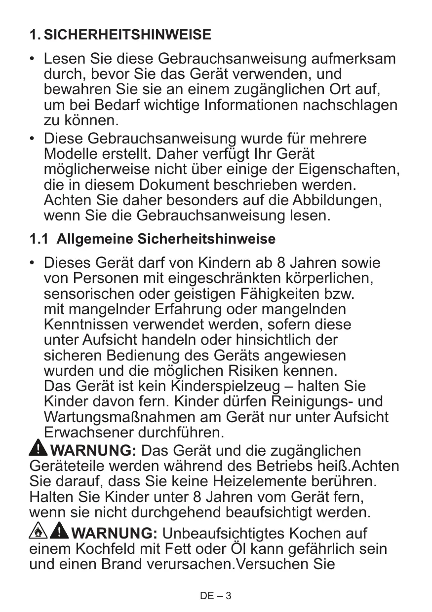 AMISE EN GARDE : Laisser cuire des aliments sans surveillance sur une table de cuisson en utilisant des matières grasses ou de l'huile peut être dangereux et déclencher un incendie. NE JAMAIS essayer d'éteindre un incendie avec de l'eau, mais arrêter l'appareil puis couvrir les flammes par exemple avec un couvercle ou une couverture anti-feu.