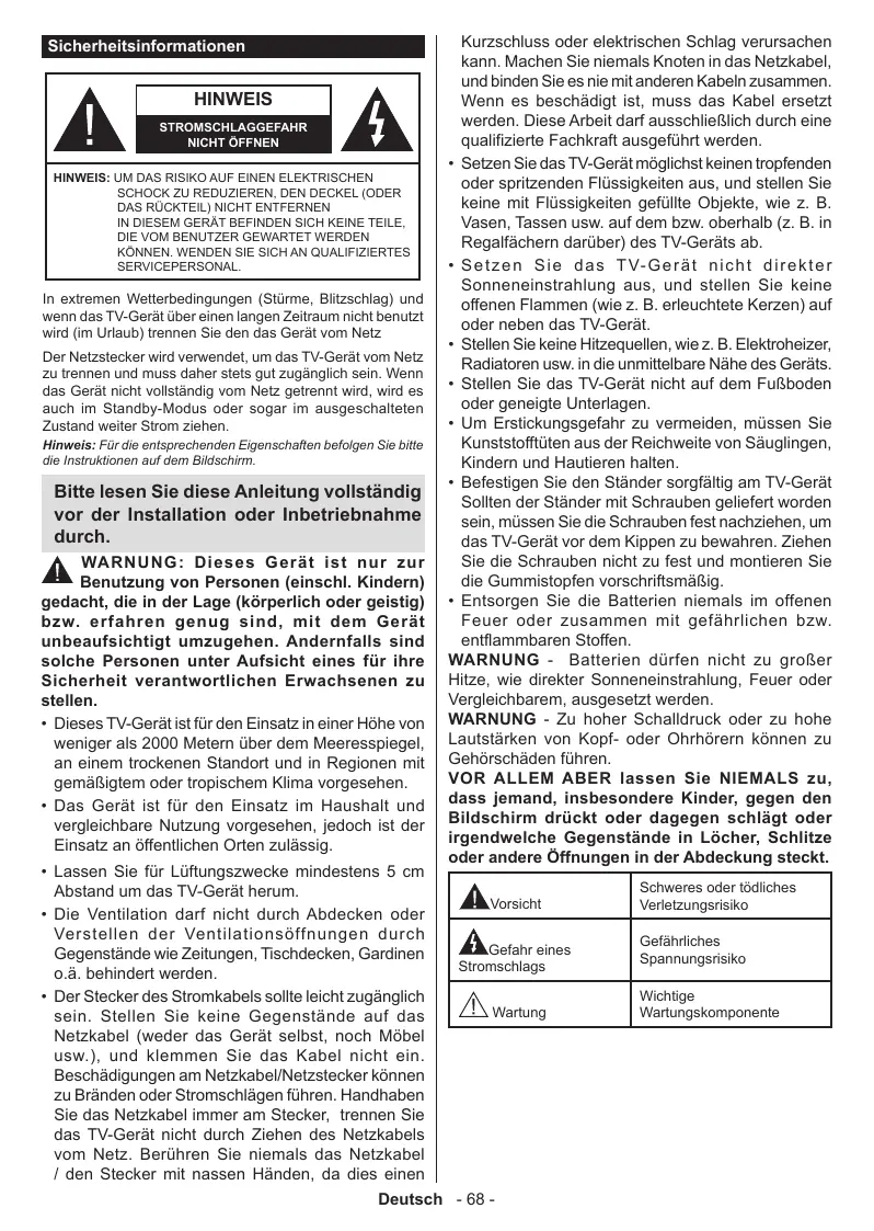 KÔNNEN. WENDEN SIE SICH AN QUALIFIZIERTES SERVICEPERSONAL. STROMSCHLAGGEFAHR NICHT OFFNEN In extremen Wetterbedingungen (Stürme, Bitzschlag) und wenn das TV-Gerät über einen langen Zeitraum nicht benutzt wird (im Urlaub) trennen Sie den das Gerät vom Netz Der Netzstecker wird verwendet, um das TV-Gerät vom Netz zu trennen und muss daher stets gut zugänglich sein. Wenn des Gerät nicht vollständig vom Netz getrennt wird, wird es auch im Standby-Modus oder sogar im ausgeschalteten Zustand weiter Strom ziehen. Hinweis: Für die entsprechenden Eigenschaften befolgen Sie bitte die Instruktionen auf dem Bildschirm. Bitte lesen Sie diese Anleitung vollständig vor der Installation oder Inbetriebnahme durch. WARNUNG: Dieses Gerät ist nur zur Benutzung von Personen (einschl. Kindern) gedacht, die in der Lage (kôrperlich oder geistig) bzw. erfahren genug sind, mit dem Gerät unbeaufsichtigt umzugehen. Andernfalls sind solche Personen unter Aufsicht eines für ihre Sicherheit verantwortlichen Erwachsenen zu stellen. + Dieses TV-Gerätist für den Einsatz in einer Hôhe von weniger als 2000 Metern über dem Meeresspiegel, an einem trockenen Standort und in Regionen mit gemäfigtem oder tropischem Klima vorgesehen. + Das Gerät ist für den Einsatz im Haushalt und vergleichbare Nutzung vorgesehen, jedoch ist der Einsatz an ôffentlchen Orten zulässig. + Lassen Sie für Lüftungszwecke mindestens 5 cm Abstand um das TV-Gerät herum. + Die Ventilation darf nicht durch Abdecken oder Verstellen der Ventilationsôffnungen durch Gegenstände wie Zeitungen, Tischdecken, Gardinen oà. behindert werden + Der Stecker des Stromkabels sole leicht zugänglich sein. Stellen Sie keine Gegenstände auf das Netzkabel (weder das Gerät selbst, noch Môbel usw.), und klemmen Sie das Kabel nicht ein. Beschädigungen am Netzkabel/Netzstecker kKônnen zu Bränden oder Stromschlägen führen. Handhaben Sie das Netzkabel immer am Stecker, trennen Sie das TV-Gerät nicht durch Ziehen des Netzkabels vom Netz. Berühren Sie niemals das Netzkabel 1 den Stecker mit nassen Händen, da dies einen Deutsch Kurzschluss oder elektrischen Schlag verursachen kann. Machen Sie niemals Knoten in das Netzkabel, und binden Sie es nie mit anderen Kabein zusammen. Wenn es beschädigt ist, muss das Kabel ersetzt werden. Diese Arbeit darf ausschlieflich durch eine qualizierte Fachkraft ausgeführt werden. + Setzen Sie das TV-Gerätmôglichst keinen tropfenden oder spritzenden Flüssigkeiten aus, und stellen Sie keine mit Flüssigkeiten gefülte Objekte, wie z. B Vasen, Tassen usw. auf dem bzw. oberhalb (z. B. in Regalfächem darüber) des TV-Geräts ab + Setzen Sie das TV-Gerät nicht direkter Sonneneinstrahlung aus, und stellen Sie keine offenen Flammen (wie z. B. erleuchtete Kerzen) auf oder neben das TV-Gerät. + Stellen Sie keine Hitzequellen, wie z. B. Elektroheizer, Radiatoren usw. in die unmittelbare Nähe des Geräts. Stellen Sie das TV-Gerät nicht auf dem FuRboden oder geneigte Unterlagen: + Um Erstickungsgefahr zu vermeiden, müssen Sie Kunststofftüten aus der Reichweite von Säuglingen, Kindern und Hautieren halten + Befestigen Sie den Ständer sorgfältig am TV-Gerät Soliten der Ständer mit Schrauben geliefert worden sein, müssen Sie die Schrauben fest nachziehen, um das TV-Gerät vor dem Kippen zu bewahren. Ziehen Sie die Schrauben nicht zu fest und montieren Sie die Gummistopfen vorschrifismäfig. Entsorgen Sie die Batterien niemals im offenen Feuer oder zusammen mit gefährlichen bzw. entflammbaren Stofien. WARNUNG - Batterien dürfen nicht zu gro8er Hitze, wie direkter Sonneneinstrahlung, Feuer oder Vergleichbarem, ausgesetzt werden. WARNUNG - Zu hoher Schalldruck oder zu hohe Lautstärken von Kopf- oder Ohrhôrern kônnen zu Gehôrschäden führen VOR ALLEM ABER lassen Sie NIEMALS zu, dass jemand, insbesondere Kinder, gegen den Bildschirm drückt oder dagegen schlägt oder irgendwelche Gegenstände in Lôcher, Schlitze oder andere Offnungen in der Abdeckung steckt. Avorser À cctan eines Stromschlags À\ wartng Schweres oder tôdiiches Veretzungsrisiko Gefähiches Spannungsrisiko Wichtige Wartungskomponente