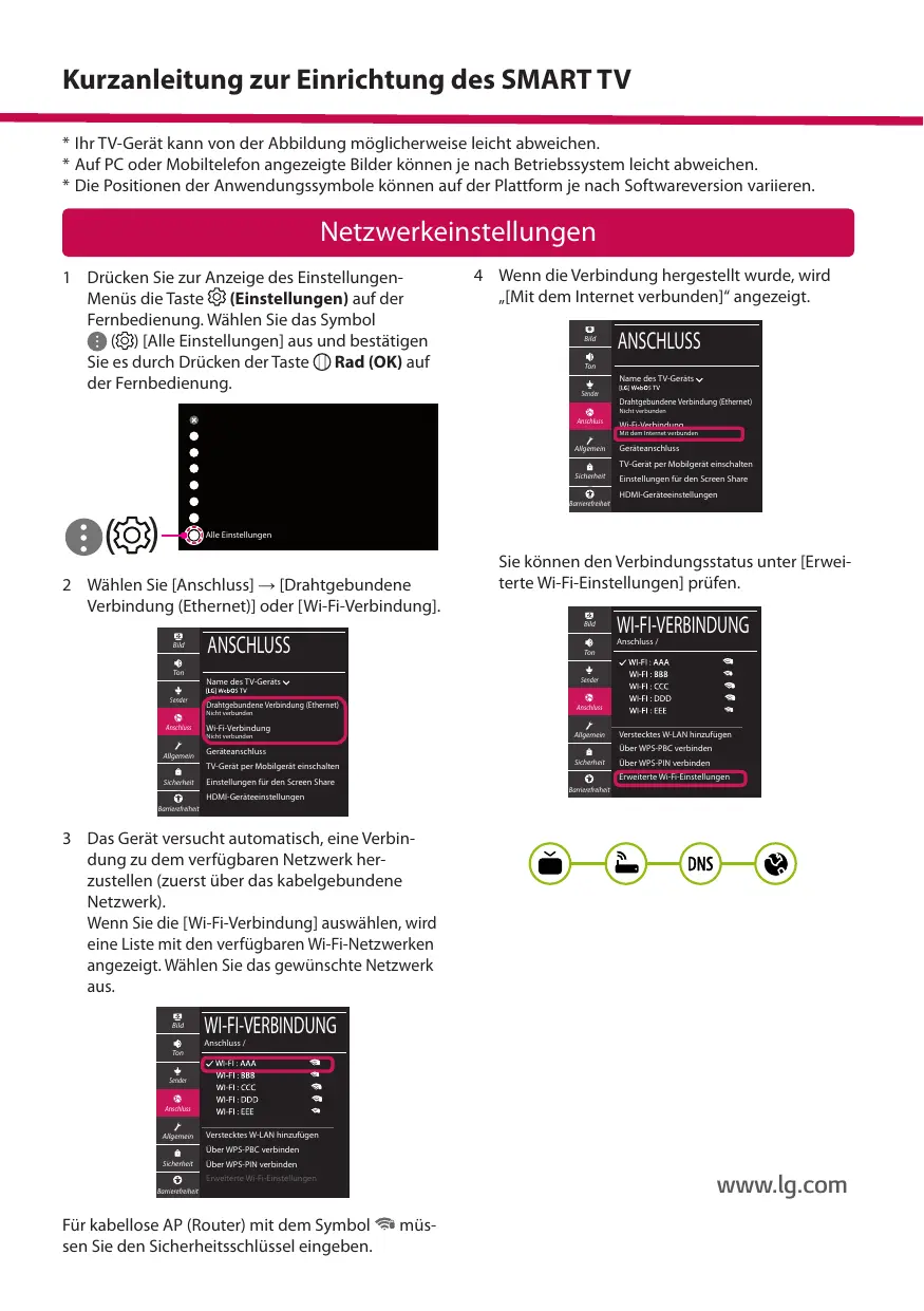 1 Drücken Sie zur Anzeige des Einstellungen- 4. Wenn die Verbindung hergestellt wurde, wird Menûüs die Taste @ (Einstellungen) auf der Mit dem Internet verbunden|" angezeigt. Fernbedienung. Wählen Sie das Symbol @ (@) lAlle Einstellungen] aus und bestätigen Sie es durch Drücken der Taste () Rad (OK) auf der Fenbedienung.