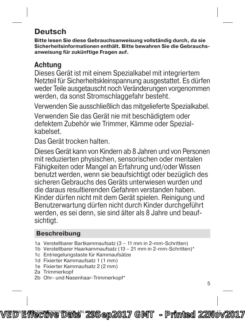 + Der abgenommene Trimmerkopf und die Kammaufsätze Kônnen unter flieBendem Wasser gereinigt werden. Lassen Sie sie vor einem Wieder- aufsetzen vollständig trocknen.