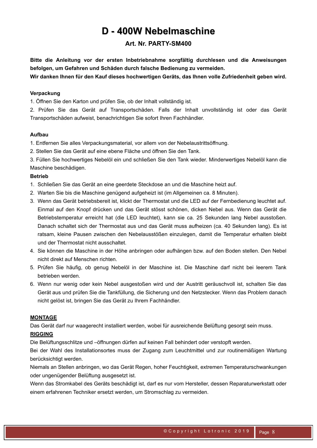 400W - Machine à fumée PARTY LIGHT&SOUND - Kostenlose Bedienungsanleitung