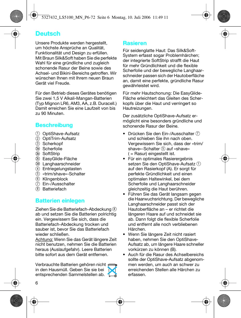 Lebensdauer nicht mit dem Hausmüll entsorgt werden. Votre Silk&Soft de Braun fonctionne avec 2 piles 1,5V. Pour une performance optimale, utilisez des piles alkalines {type LR6, AM3, AA Duracel). Ces piles procurent une capacité de rasage de jusqu'à environ 90 minutes.