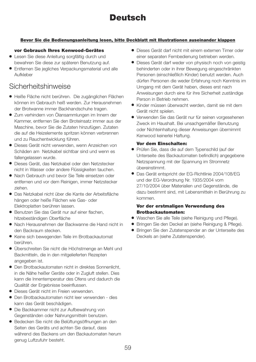 Verwenden Sie das Gerät nur für seinen vorgesehenen Zweck im Haushalt. Bei unsachgemäBer Benutzung oder Nichteinhatung dieser Anweisungen übernimmt Kenwood keinerlei Haftung.