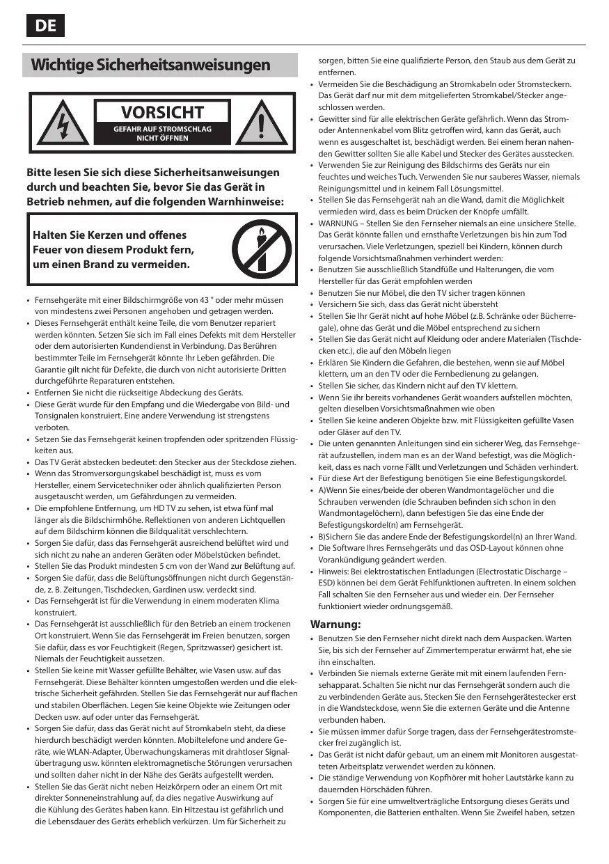 + Cette TV ne contient aucune pièce qui pourrait être réparée par l'utilisateur. En cas de défaut, contacter le fabricant ou l'agent autorisé qui assure le service après-vente. Le contact avec certaines parties situ- es à l'intérieur de la TV pourrait mettre votre vie en danger. La garantie ne couvre pas les défauts provoqués par des réparations effectuées par des tiers non autorisés.