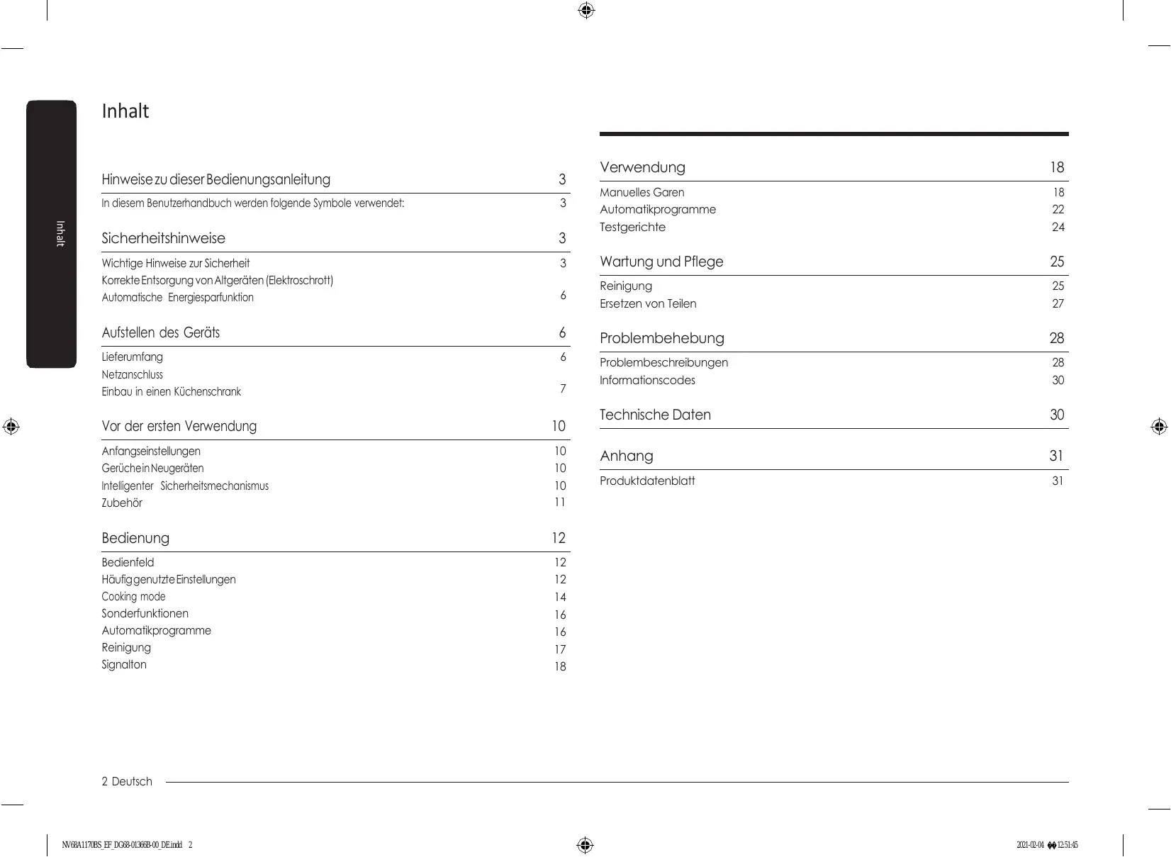 Inhalt . . . . Verwendung 18 Hinweise zu dieser Bedienungsanleitung 3 Manuelles Garen 18 In diesem Benutzerhandbuch werden folgende Symbole verwendei 3 Automatikprogramme 2 z . Lu Testgerichte 24 ss Sicherheïtshinweise 3 Wichtige Hinweise zur Sicherheit 3 Wartung und Pflege 25 Korrekte Entsorgung vonAltgeräten [Elektroschrott) Reinigung 3 Automafiche Energiespartunktion 6 Esetzen von Tellen 2 Aufstellen des Geräts 6 Problembehebung 28 Lieferumfang é Problembeschreibungen 28 Nefzanschluss Infomationscodes 30 Einbau in einen Küchenschrank 7 Technische Daten 30 Vor der ersten Verwendung 10 Anfangseinstelungen 10 Anhang 31 GerücheinNeugeräten 10 Inteligenter Sicherheïtsmechanismus 10 Produkidatenblatt 3 Zubehôr nl Bedienung 12 Bedienfeld 12 Hävfggenutzte Enstelungen 12 Cooking mode 14 Sonderfunktionen 16 Automatikprogramme 16 Reinigung 17 Signalton 18 2 Deutsch