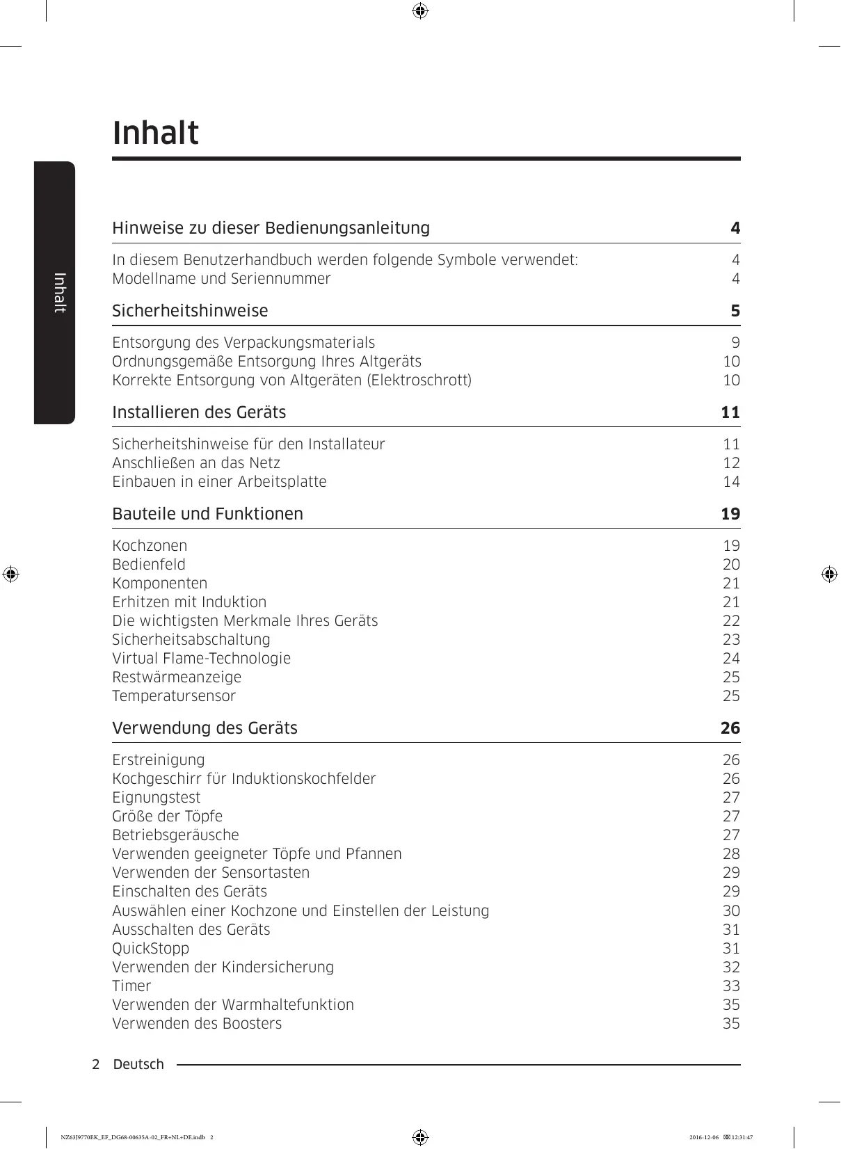 Hinweise zu dieser Bedienungsanleitung 4 In diesem Benutzerhandbuch werden folgende Symbole verwendet: 4 Modellname und Seriennummer 4 Sicherheitshinweise 5 Entsorgung des Verpackungsmaterials 9 Ordnungsgemäêe Entsorgung lhres Altgeräts 10 Korrekte Entsorgung von Altgeräten (Elektroschrott) 10 Installieren des Geräts 11 Sicherheitshinweise für den installateur 11 Anschlie&en an das Netz 12 Einbauen in einer Arbeitsplatte 14 Bauteile und Funktionen 19 Kochzonen 19 Bedienfeld 20 Komponenten 21 Erhitzen mit Induktion 21 Die wichtigsten Merkmale Ihres Geräts 22 Sicherheitsabschaltung 23 Virtual Flame-Technologie 24 Restwärmeanzeige 25 Temperatursensor 25 Verwendung des Geräts 26 Erstreinigung 26 Kochgeschirr für Induktionskochfelder 26 Eignungstest 27 Grôke der Tôpfe 27 Betriebsgeräusche 27 Verwenden geeigneter Tôpfe und Pfannen 28 Verwenden der Sensortasten 29 Einschalten des Geräts 29 Auswählen einer Kochzone und Einstellen der Leistung 30 Ausschalten des Geräts 31 QuickStopp 31 Verwenden der Kindersicherung 32 Timer 33 Verwenden der Warmhaltefunktion 35 Verwenden des Boosters 35