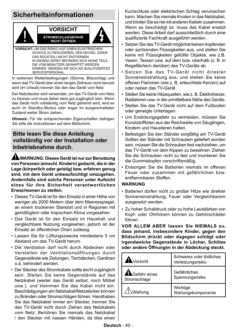 + Setzen Sie das TV-Gerätmôglichst keinen tropfenden oder spritzenden Flüssigkeiten aus, und stellen Sie keine mit Flüssigkeiten gefüllte Objekte, wie z.B Vasen, Tassen usw. auf dem bzw. oberhalb (z. B. in Regalfächem darüber) des TV-Geräts ab