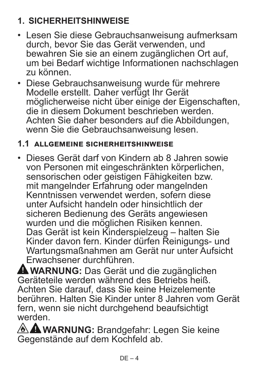 /\ ACHTUNG: Von aufen zugängliche Teile kKônnen beim Kochen oder Grillen heiR werden. Halten Sie kleine Kinder vom Gerät fern, wenn dieses eingeschaltet ist.
