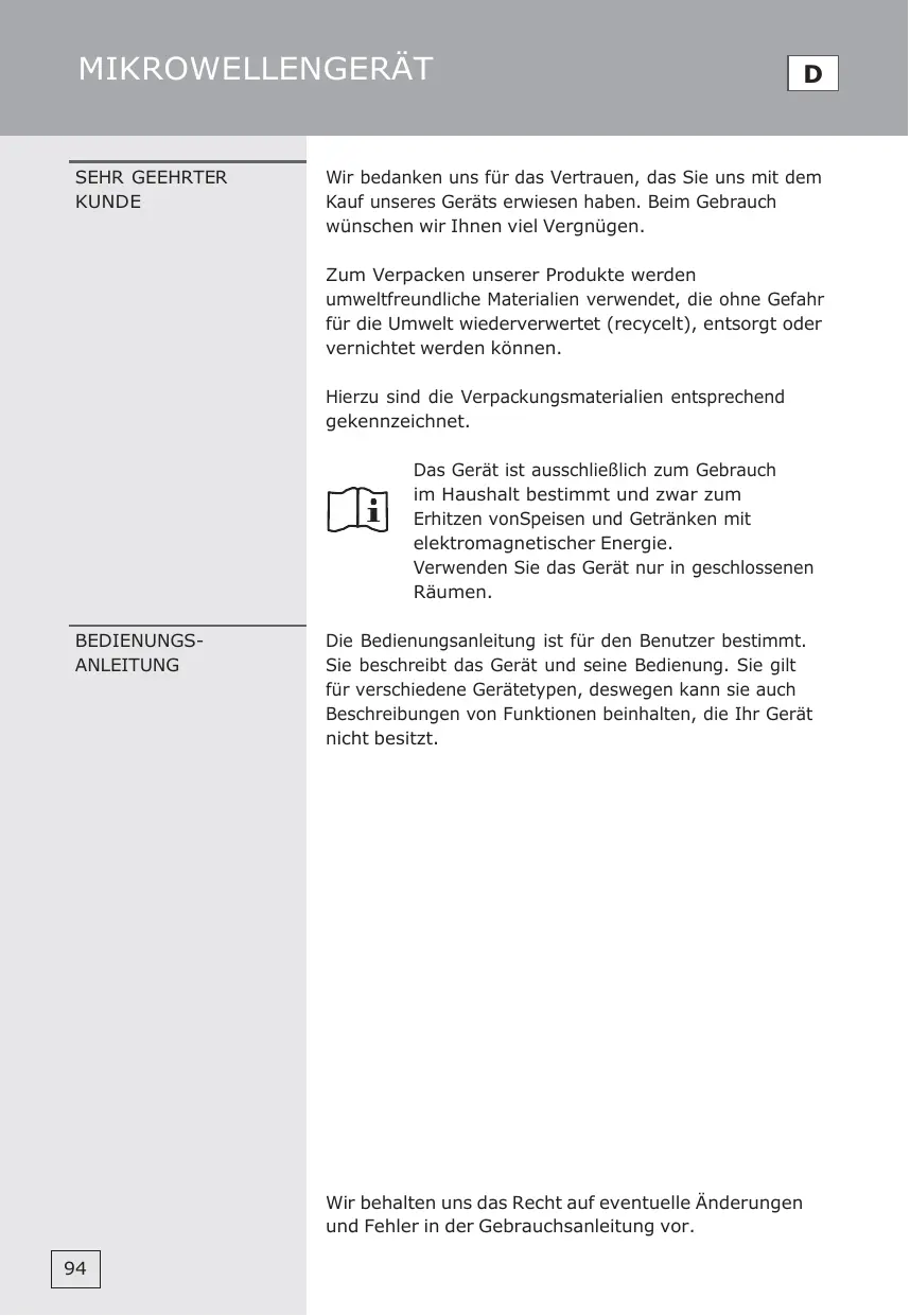 + N'utilisez que des récipients appropriés pour le micro- ondes et du film alimentaire dans le micro-ondes. Percez le film avec une fourchette avant la cuisson.