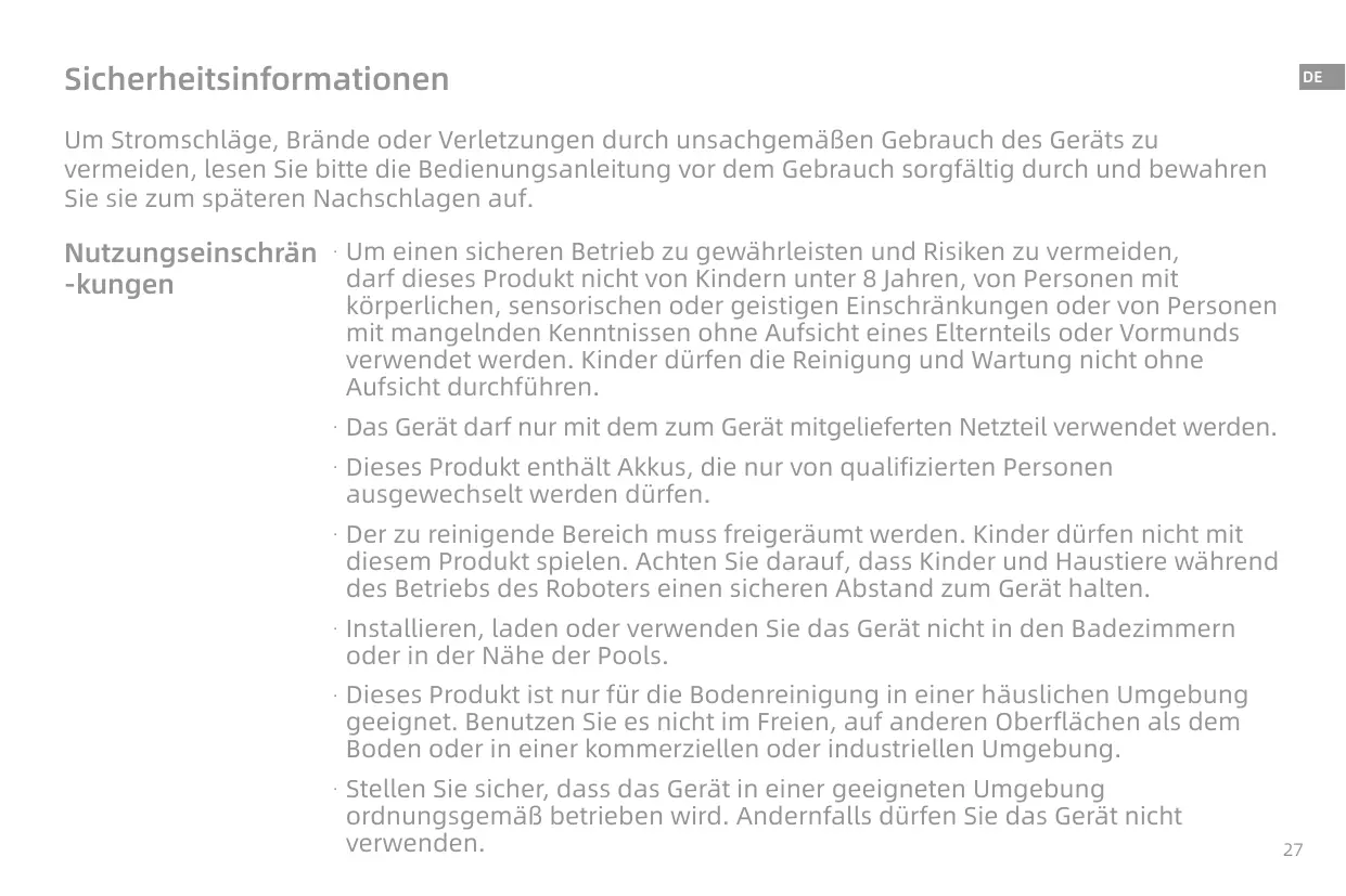 diesem Produkt spielen. Achten Sie darauf, dass Kinder und Haustiere während des Betriebs des Roboters einen sicheren Abstand zum Gerät halten.