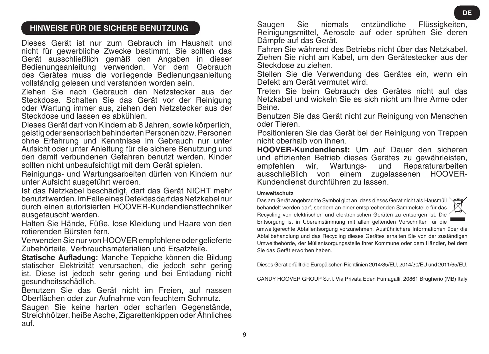 Service HOOVER : Pour assurer l’utilisation sûre et efficace de cet appareil, nous recommandons de n'en confier l'entretien ou les réparations qu’à un réparateur HOOVER agréé.