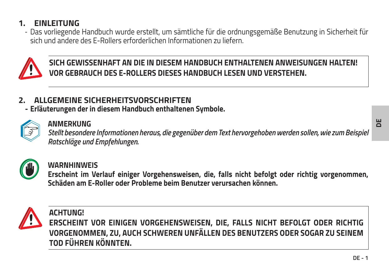 - Der Roller ist mit einem aufladbaren Lithium-lonen-Akku und einem für das ordnungsgemäBe Laden geeigneten Ladegerät ausgestattet. DE