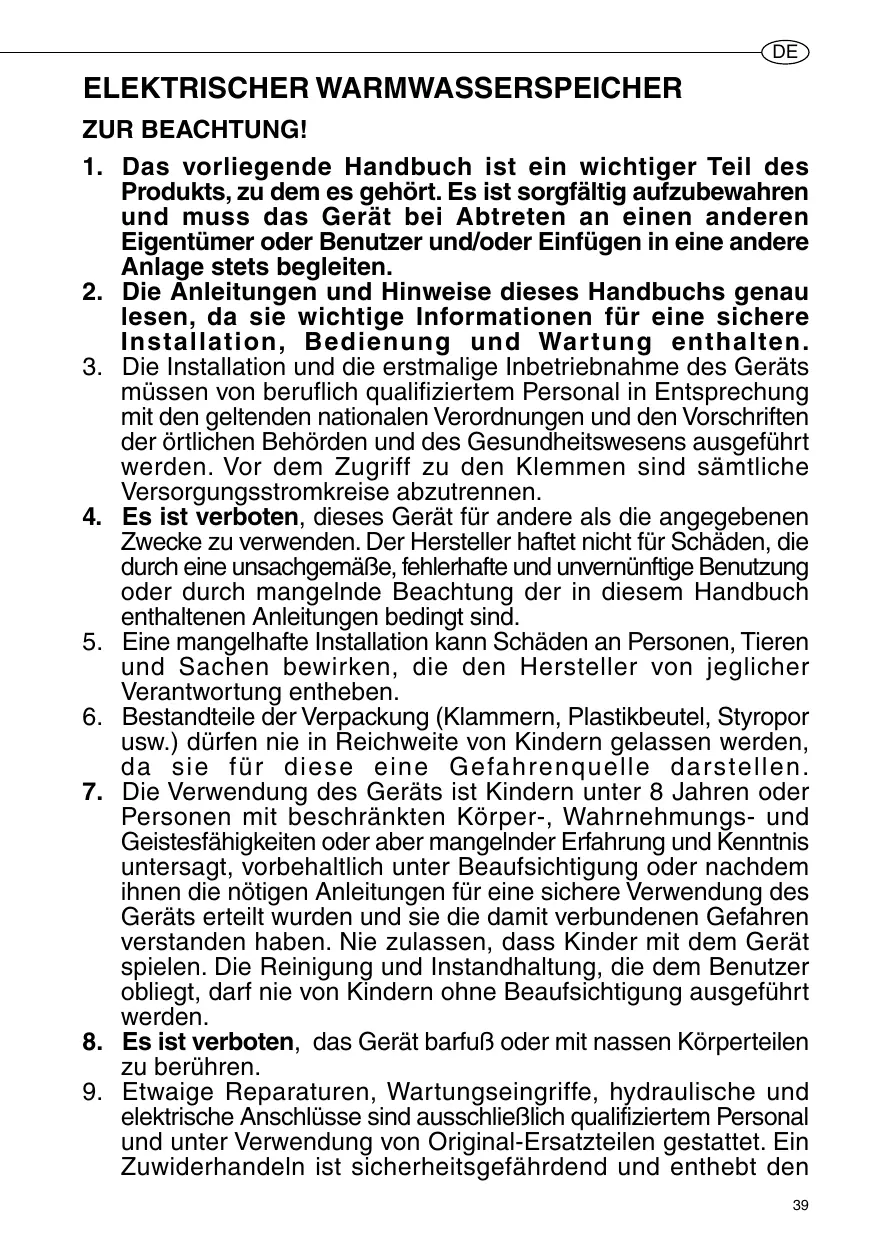 ELEKTRISCHER WARMWASSERSPEICHER ZUR BEACHTUNG!