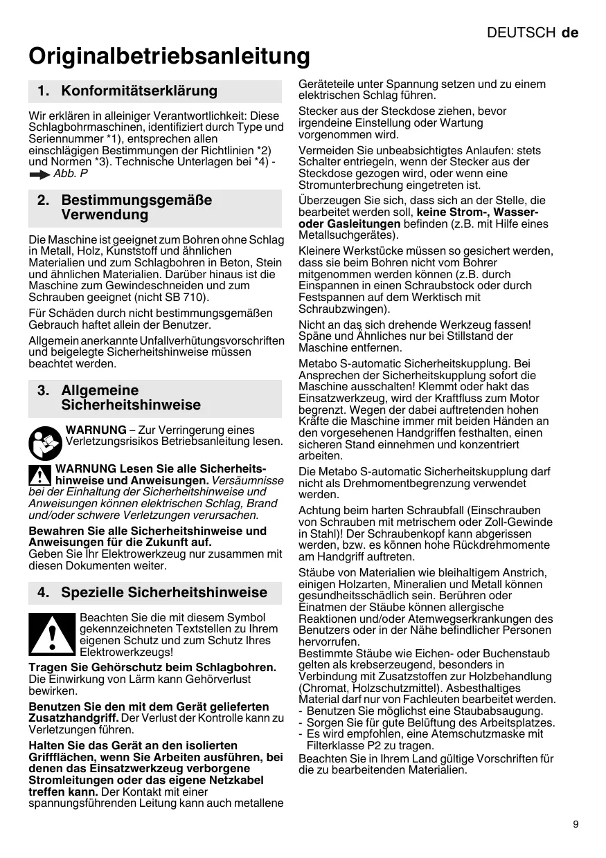 SB 710 SBE 701 SP SBE 710 SBE 730 SBE 751 SBE 850 SBE 900 Impuls SBE 1000 SBE 1100 Plus SBE 1300 - Schlagbohrmaschine METABO - Kostenlose Bedienungsanleitung