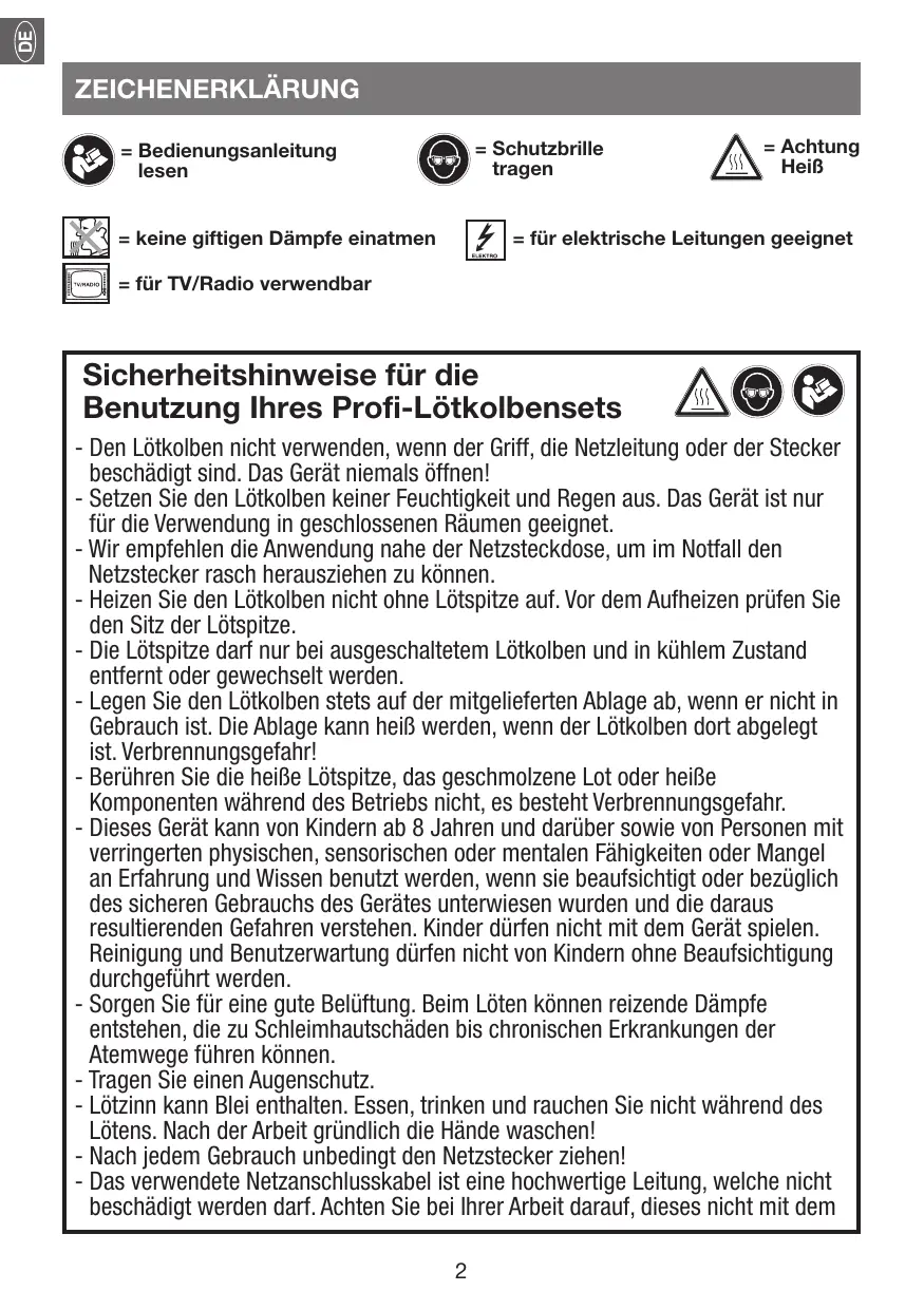 - Ne pas utiliser le fer à souder lorsque la poignée, la conduite électrique ou la fiche sont endommagées. Ne jamais ouvrir l'appareil !