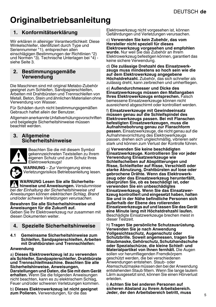 Laden Sie die Anleitung für Ihr Winkelschleifer kostenlos im PDF-Format! Finden Sie Ihr Handbuch W 22-180 MVT W 22-230 MVT WE 22-180 MVT WE 22-230 MVT WE 22-230 MVT Quick - METABO und nehmen Sie Ihr elektronisches Gerät wieder in die Hand. Auf dieser Seite sind alle Dokumente veröffentlicht, die für die Verwendung Ihres Geräts notwendig sind. W 22-180 MVT W 22-230 MVT WE 22-180 MVT WE 22-230 MVT WE 22-230 MVT Quick von der Marke METABO.