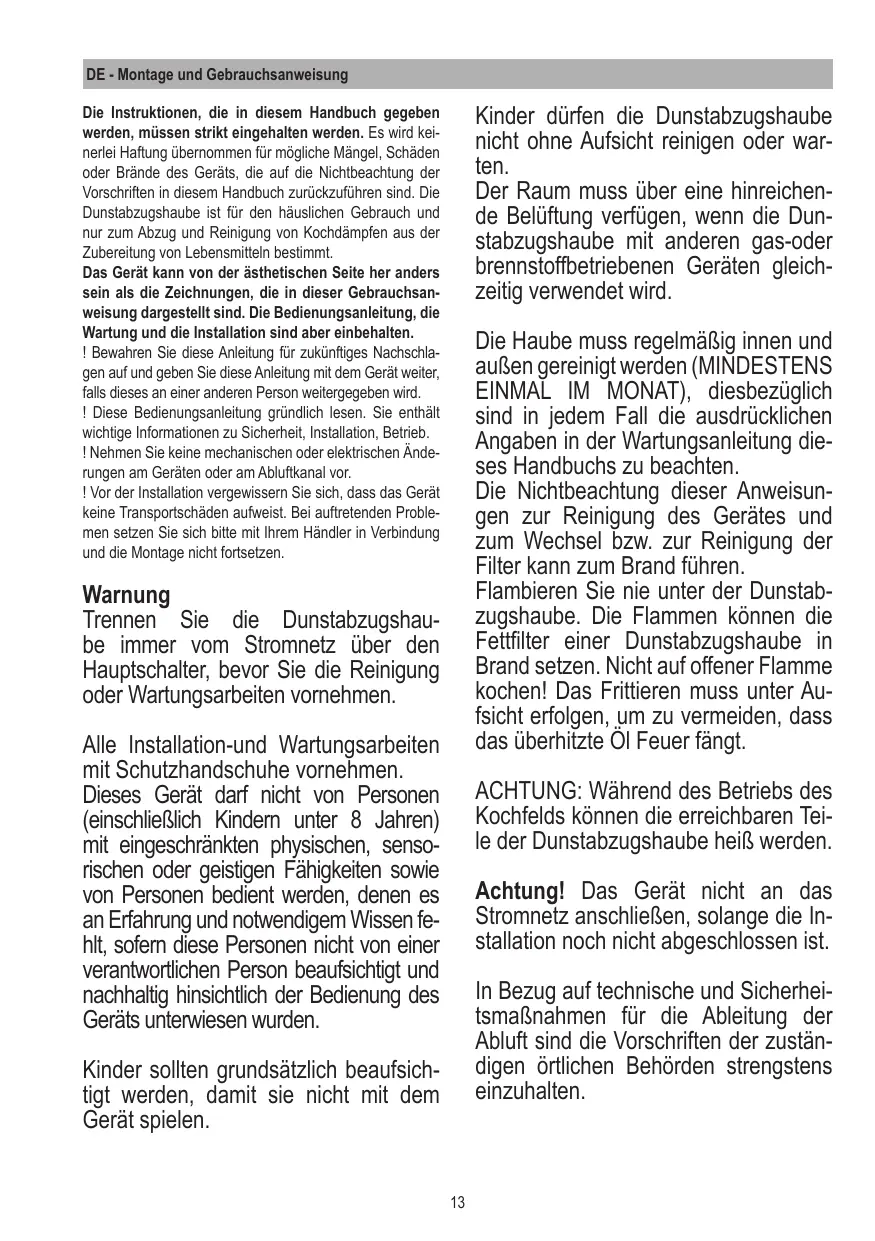 La hotte ne doit JAMAIS être utilisée comme un support, sauf indication con- traire.