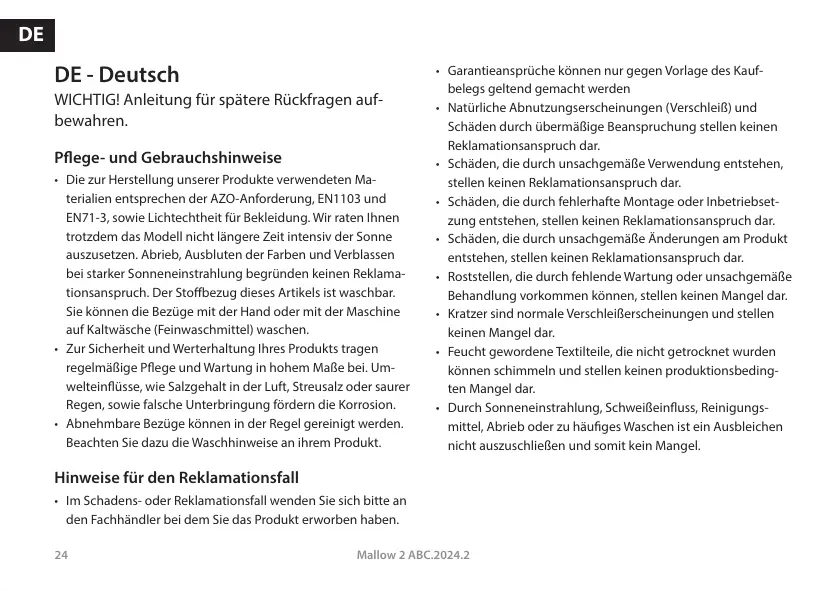 + Les matériaux utilisés pour la fabrication de nos produits sont conformes aux exigences AZO, aux normes ENT 103 et EN71-3 et aux exigences de stabilité à la lumière et de stabi- lité des couleurs valables pour les vêtements. Nous vous re- commandons néanmoins d'éviter une exposition prolongée etintense au soleil. Lusure ainsi que des couleurs délavées et déteintes par une forte insolation ne donnent pas droit à
