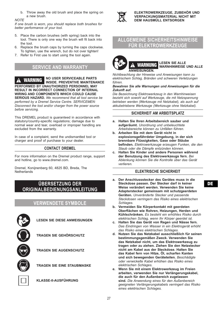 6. Setzen Sie die Kohlebürsten mit den Fedemn wieder @ AVEC LES ORDURES MÉNAGÈRES in das Werkzeug ein. Die Bürste passt nur in einer bestimmten Ausrichtung in das Gerät 6. Schrauben Sie die Bürstenkappen im Unrzeigersinn auf. Verwenden Sie hierzu den Spannzangenschlüssel Die Kappen dürfen nicht zu fest angezogen werden! 7. Vor der Wiederinbetriebnahme des WWerkzeugs siehe Senviceniederlassungen durchführen zu lassen. Conservez ces avertissements et ces consignes à des WARTUNGSTECHNIKER: Trennen Sie das Werkzeug bzw. fins de référence future.