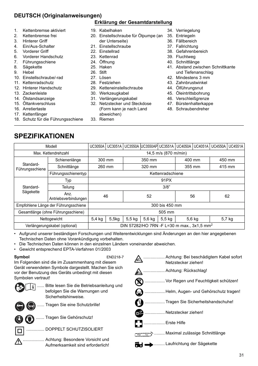 1. Kettenbremse aktiviert 19. Kabelhaken 34. Verriegelung 2. Kettenbremse frei 20. Einstellschraube für ©lpumpe (an 35. Entriegeln 3. Hinterer Gif der Unterseite) 36. Fällbereich 4. Ein/Aus-Schalter 21. Einstellschraube 37. Falrichtung 5. Vorderer Griff 22. Einstellrad 38. Gefahrenbereich 6. Vorderer Handschutz 23. Kettenrad 39. Fluchtweg 7. Führungsschiene 24. Offnung 40. Schnittlänge 8. Sägekette 25. Haken 41. Abstand zwischen Schnittkante 9. Hebel 26. Stift und Tiefenanschlag 10. Einstellschraube/-rad 27. Lôsen 42. Mindestens 3 mm 11. Kettenradschutz 28. Festziehen 43. Zahnbrustwinkel 12. Hinterer Handschutz 29. Ketteneinstellschraube 44. Glführungsnut 13. Zackenleïste 30. Werkzeugkabel 45. Üleintrittsbohrung 14. Ülstandsanzeige 31. Verängerungskabel 46. VerschleiRgrenze 15. Ôltankverschluss 32. Netzstecker und Steckdose 47. Bürstenhalterkappe 16. Arretiertaste {Form kann je nach Land 48. Schraubendreher 17. Kettenfänger abweichen) 18. Schutz für die Führungsschiene 33. Riemen SPEZIFIKATIONEN Modell UCa050A [UC051A [ ucassoA Jucassoap] uc3551A [uc4oSoA [UC405tA [UC4S5oA | UC4SStA Max. Kettendrehzahl 14,5 m/s (870 m/min) Schienenlänge 300 mm 350 mm 400 mm 450 mm Standard- Fübungsschiene | Schnitlänge 260 mm 320 mm 355 mm 415 mm Führungsschienentyp Kettenradschiene TP 91PX Standard- Telung ETS Sägekette Anz. Antriebsverbindungen 48 #2 54 62 Empfohlene Länge der Führungsschiene 300 bis 450 mm Gesamtlänge (ohne Führungsschiene) 505 mm Nettogewicht 54kg [ 55kg [55kg [56k9 [55kg] 56k9 57 kg Verlängerungskabel (optional) DIN 57282/H0 7RN -F L=30 m max., 3x1,5 mm?