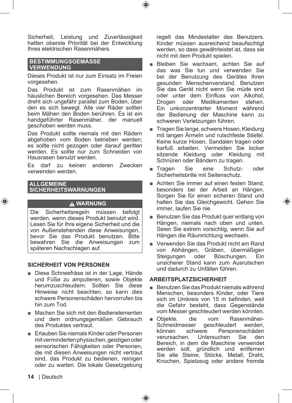 = La tondeuse à gazon est capable d'amputer les mains et les pieds, ainsi que de projeter des objets. Le non-respect de toutes les règles de sécurité est susceptible d'entraîner des blessures graves voire mortelles.