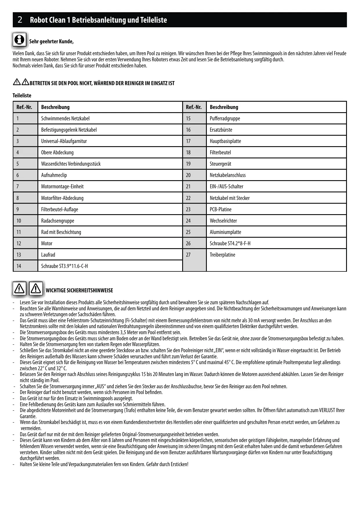 2 GARANTIE Ce robot nettoyeur de piscine a été fabriqué, testé et inspecté avec soin conformément aux exigences spécifiques de l'ingénierie et des régulations actuelles.
